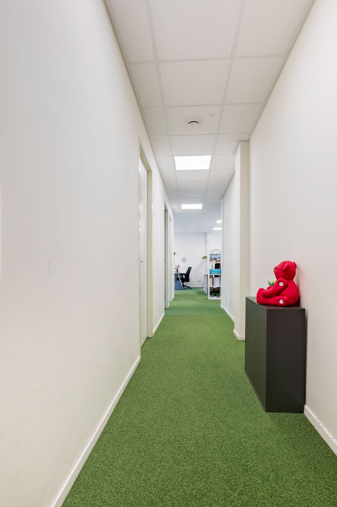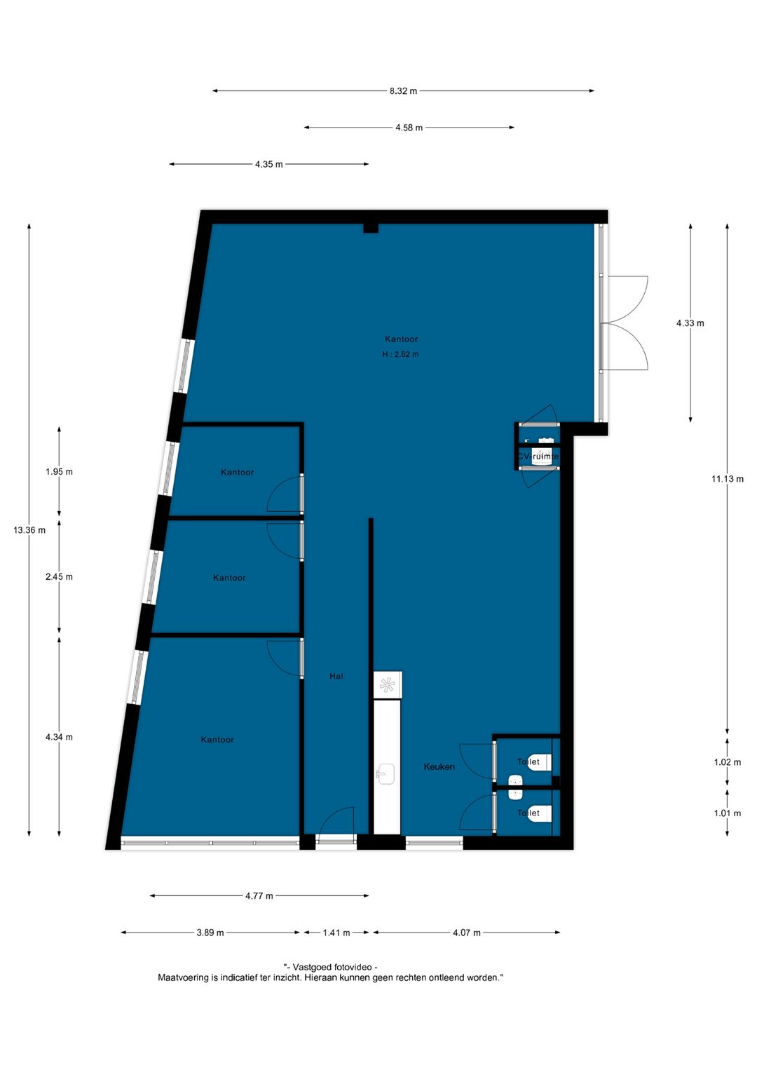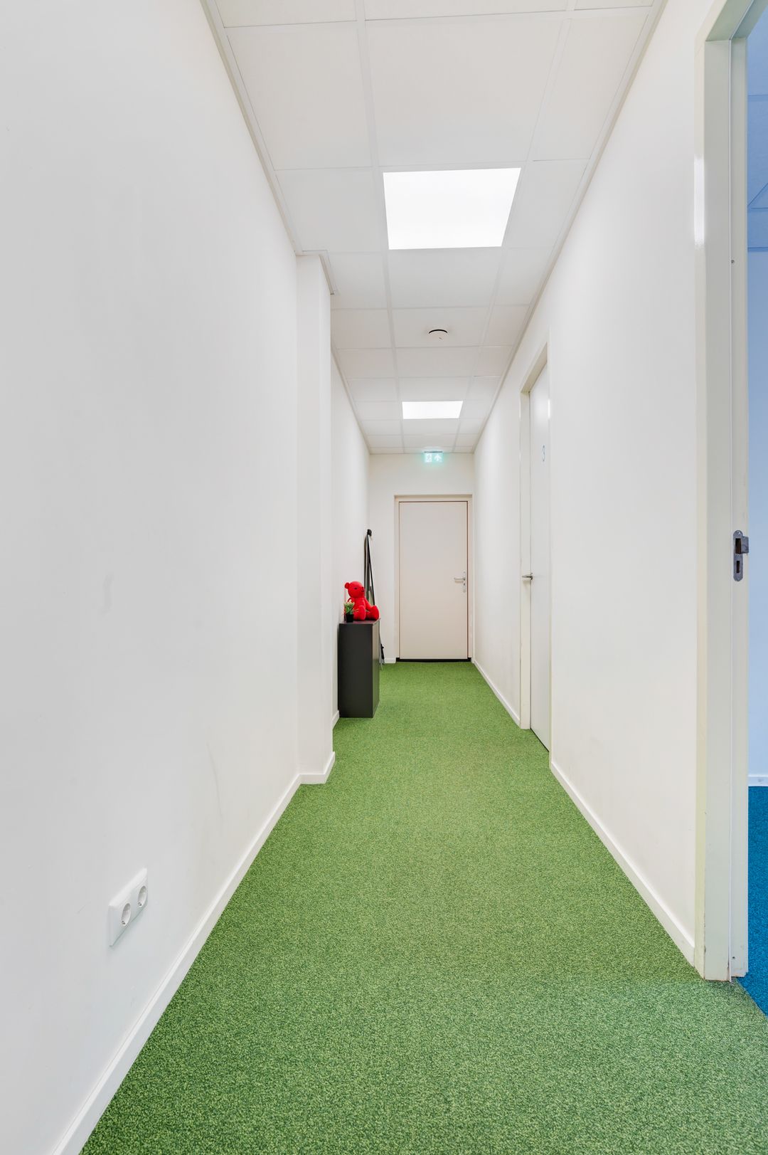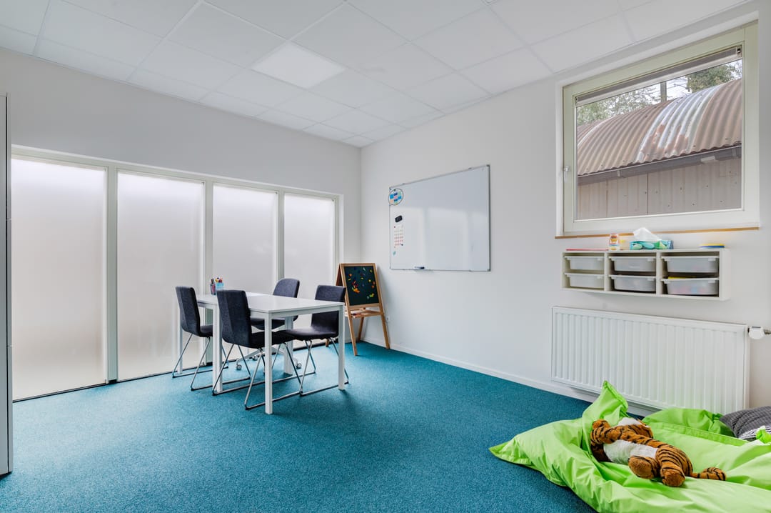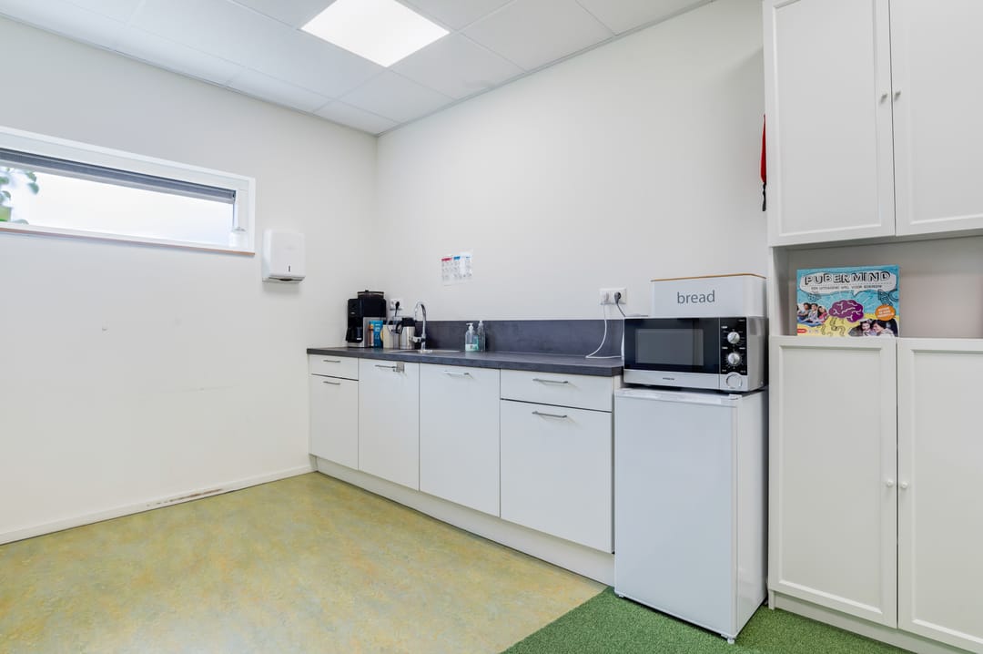 Entree aan de voorzijde middels openslaande deuren, een ruime ontvangst waar diverse mogelijkheden voor te bedenken zijn. Denk bijvoorbeeld aan het creëren van een ontvangst en diverse werkplekken. Daarnaast treft u hier een drietal, in afmeting variërend, aparte ruimtes (kantoorruimtes/ gespreksruimtes/ behandelruimtes) met extra geïsoleerde wanden.