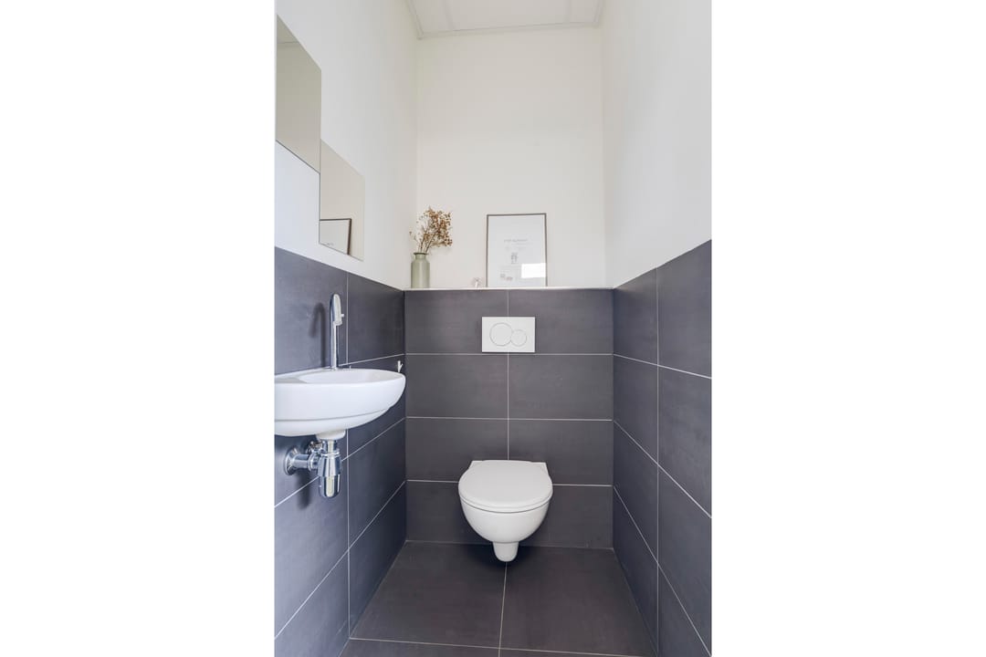 Aan de linkerzijde treft u een kitchenette voorzien van vaatwasser met daartegenover 2 toiletruimtes.