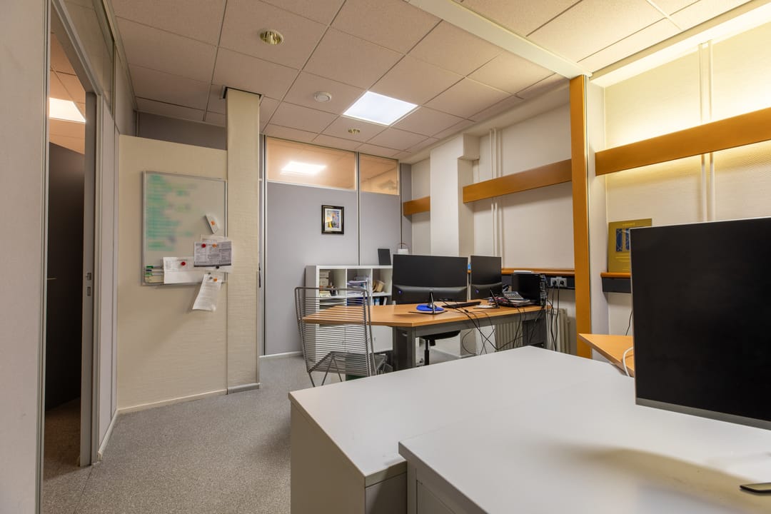 De kantoorruimte is praktisch ingedeeld en voorzien van alle benodigde faciliteiten voor een moderne werkomgeving.