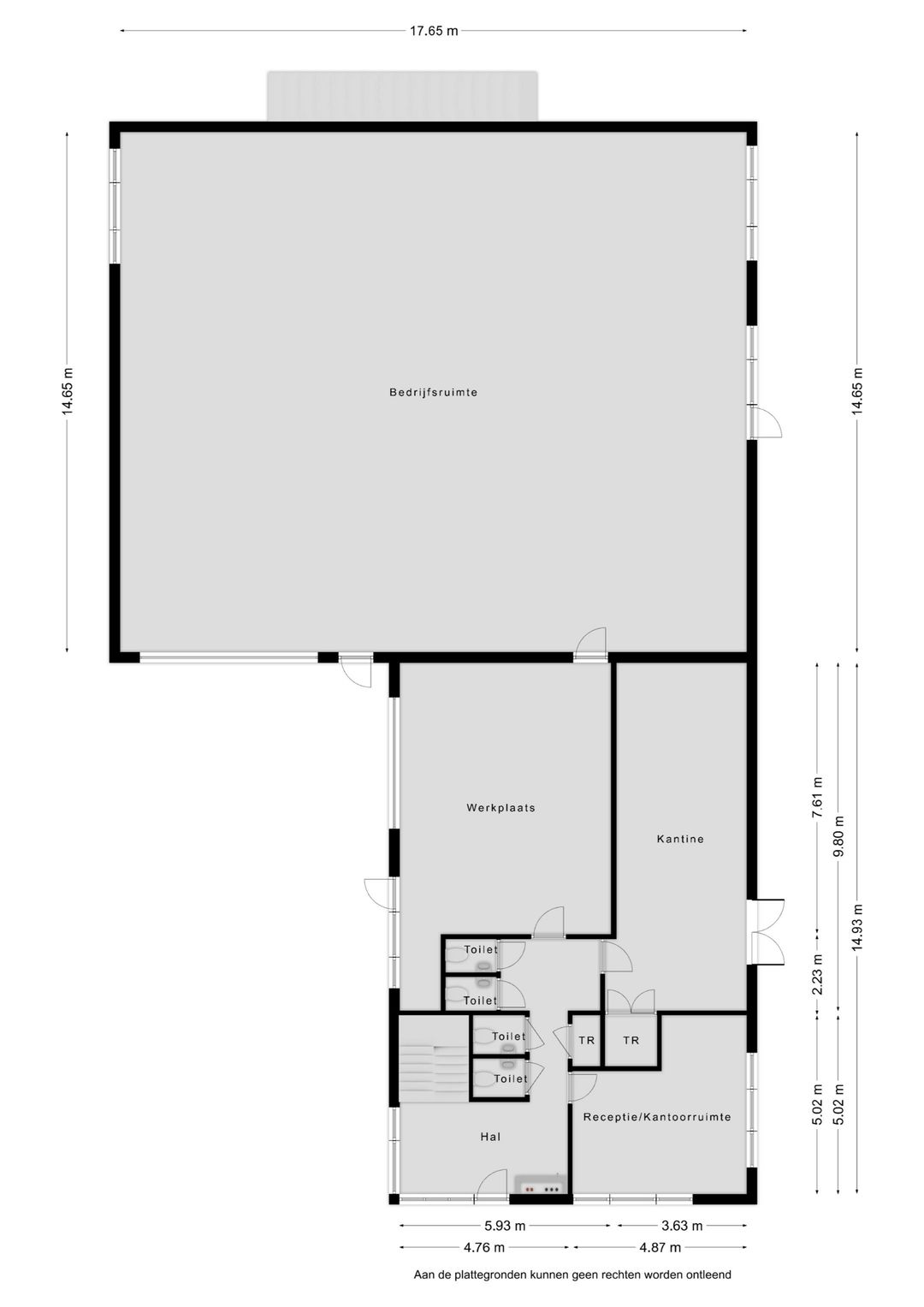 Op de begane grond zijn onder meer een entree/hal met meterkast en serverruimte, toiletgroep (3 hangende toiletten en een urinoir), receptie/kantoorruimte (ca. 22,3 m²), kantine (ca. 36,4 m²) met dubbele buitendeuren en een techniekruimte, werkplaats (ca. 49,1 m², hoogte ca. 3.00 m) met buitendeur en overheaddeur (breedte ± 3.75 m en hoogte ± 2.60) en een bedrijfsruimte (ca. 270 m²) met 2x een buitendeur en een overheaddeur (breedte ± 5.00 m en hoogte ± 4.20 m, elektrisch bedienbaar). De gehele begane grond (inclusief werkplaats en bedrijfsruimte) is voorzien van vloerverwarming.