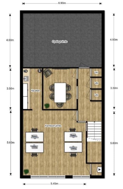 De kantoorruimte is bereikbaar via een gezamenlijke entree op de begane grond, met trapopgang naar de verdieping. De verdieping bestaat uit een open kantoorruimte met een aparte spreekruimte en een afsluitbare opslagruimte. Deze opslagruimte kan desgewenst eenvoudig worden ingericht als extra kantoorruimte.