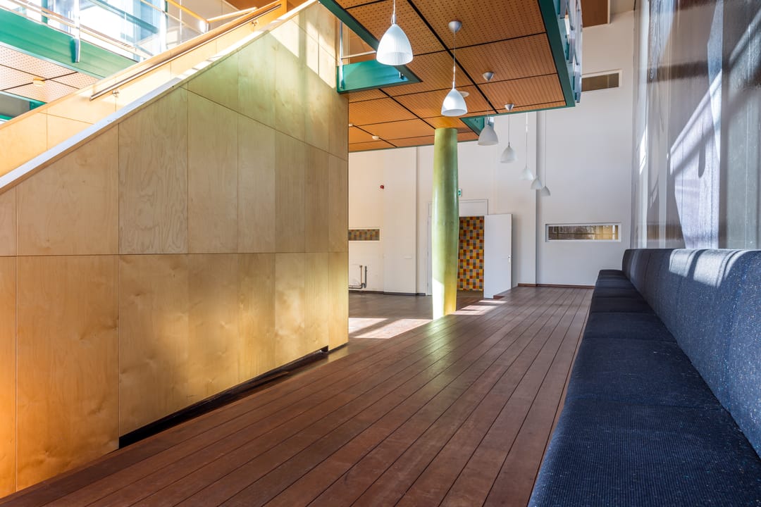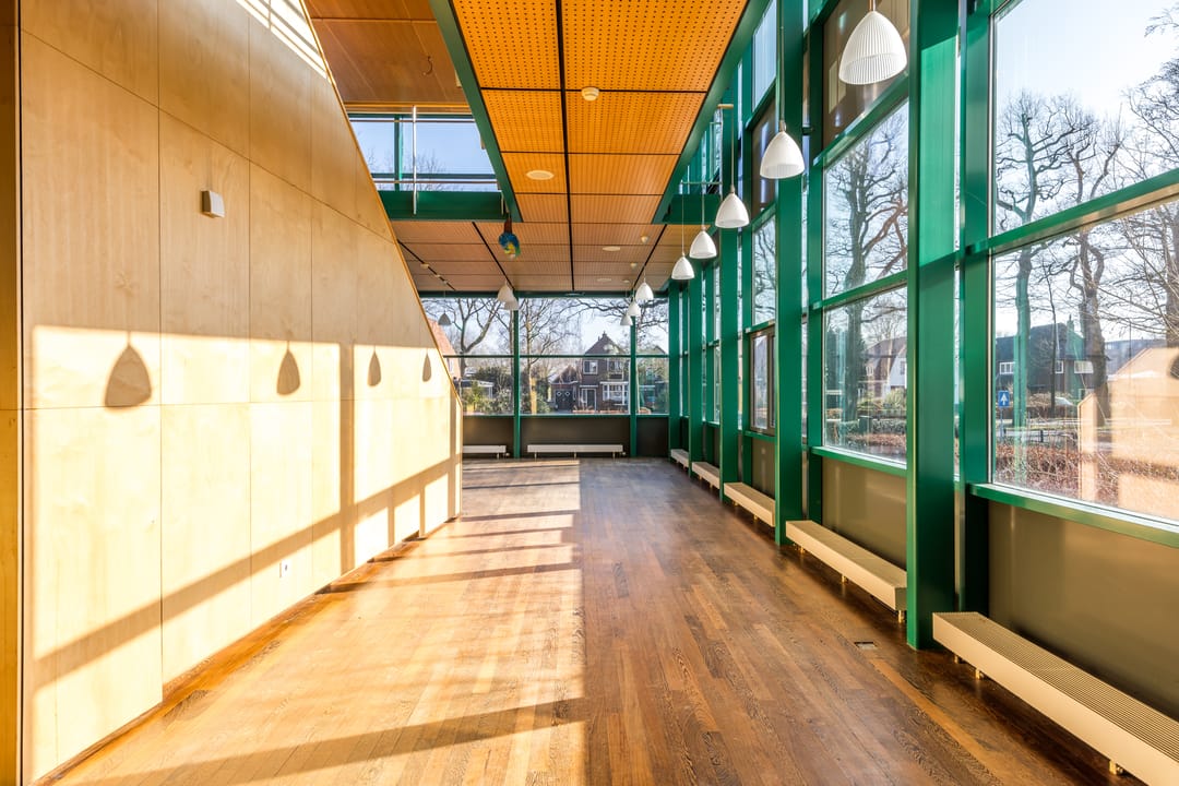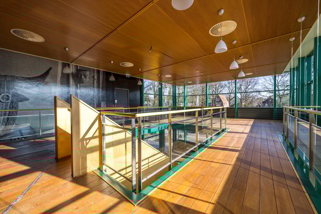 De kantoorruimte heeft een open karakter en is verdeeld over twee lagen met een uniek uitzicht.