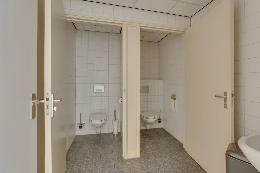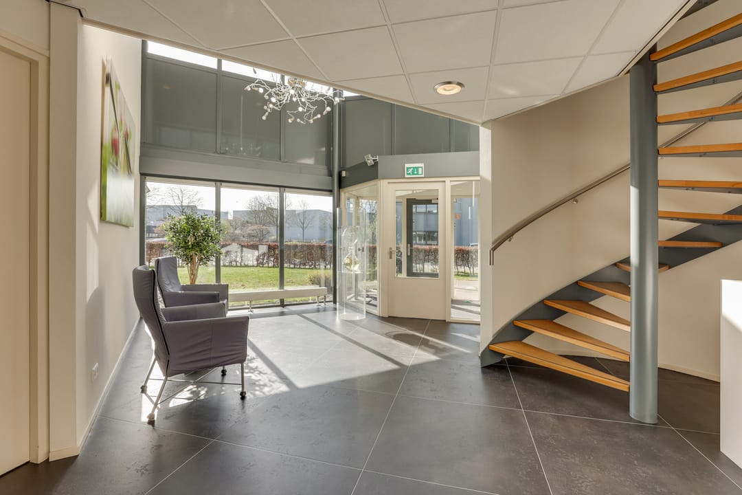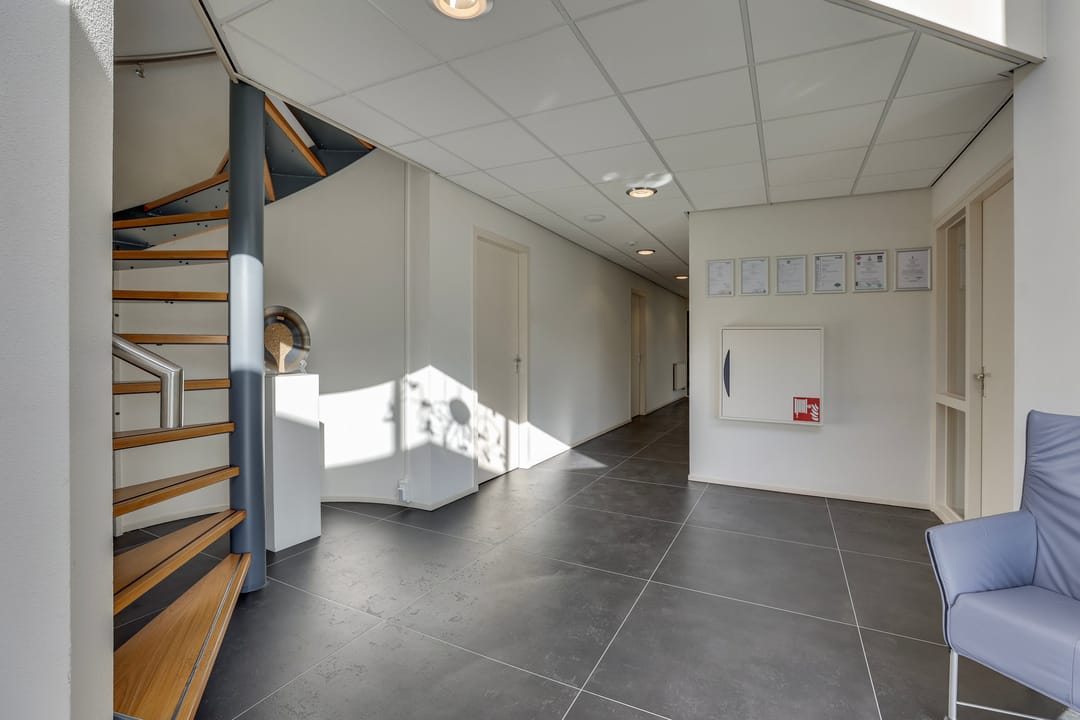 Het kantoorgebouw beschikt over een ruime centrale entree met toegang tot diverse kantoorruimtes, sanitaire voorzieningen en een kantine met pantry. Op de verdieping bevinden zich meerdere kantoorruimtes en aanvullende sanitaire voorzieningen, waardoor het pand efficiënt en flexibel in te delen is voor verschillende bedrijfsactiviteiten.