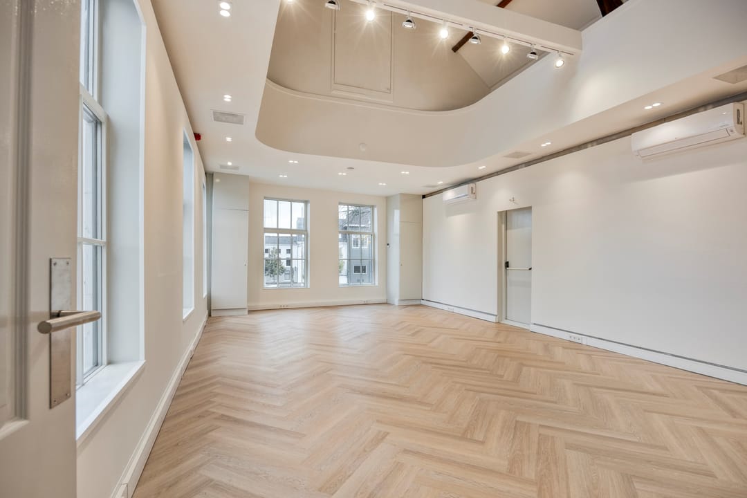 Open kantoorruimte met eigen keuken en toilet, veel lichtinval dankzij grote raampartijen.