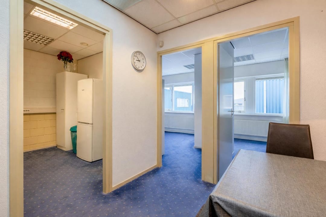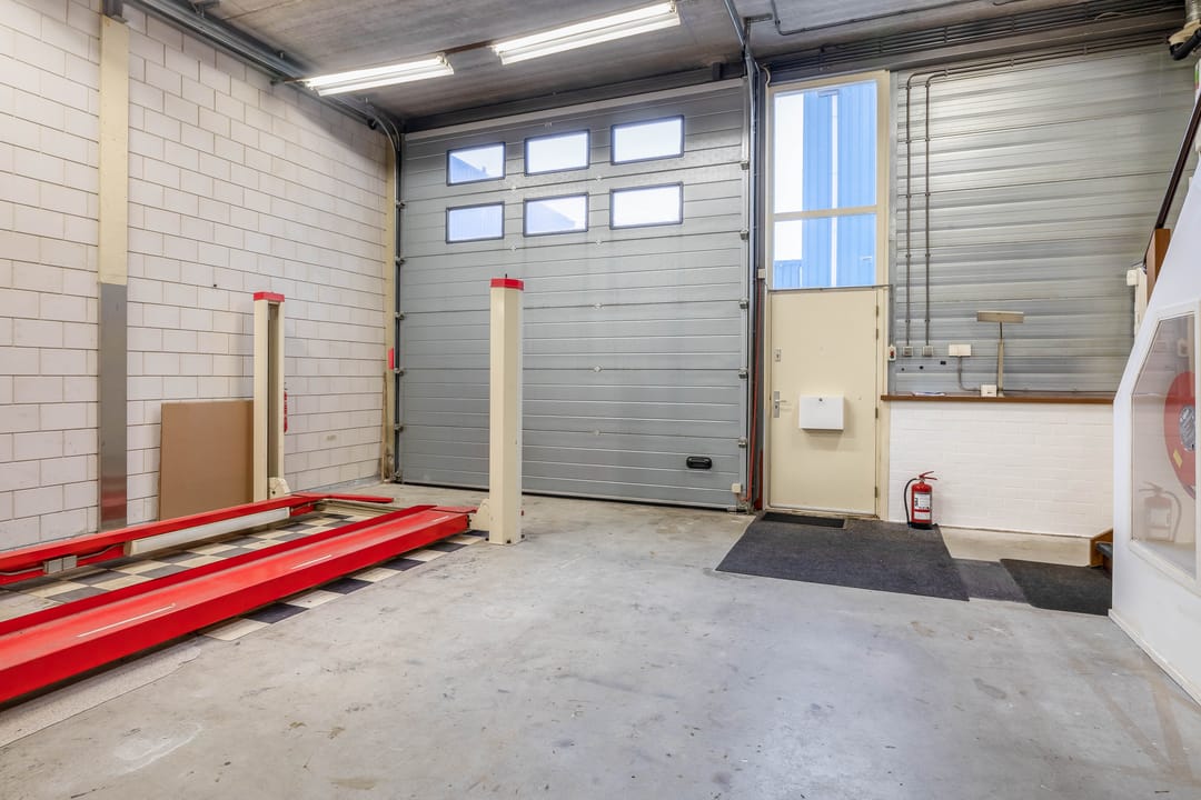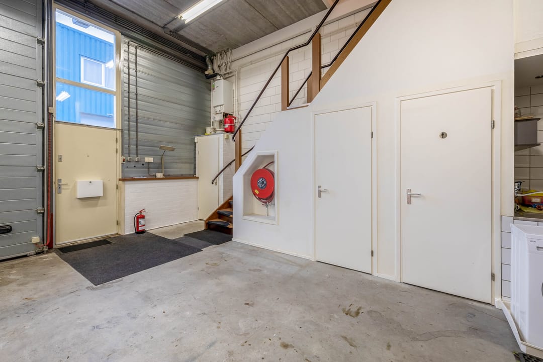 De bedrijfsruimte is ruim opgezet en voorzien van een betonnen vloer, elektrische overheaddeur, achteruitgang en een vrije hoogte van circa 4,5 meter. De ruimte is momenteel ingedeeld in twee open zones en beschikt over extra geplaatste entresols, ideaal voor voorraad of opslag. Daglichttoetreding en brandvoorzieningen zijn aanwezig.