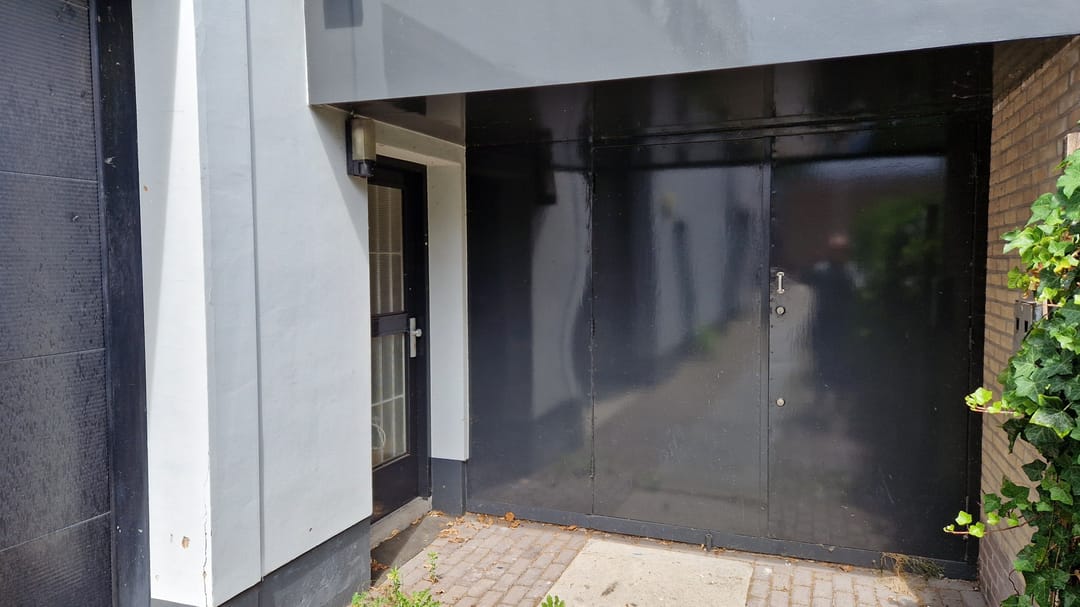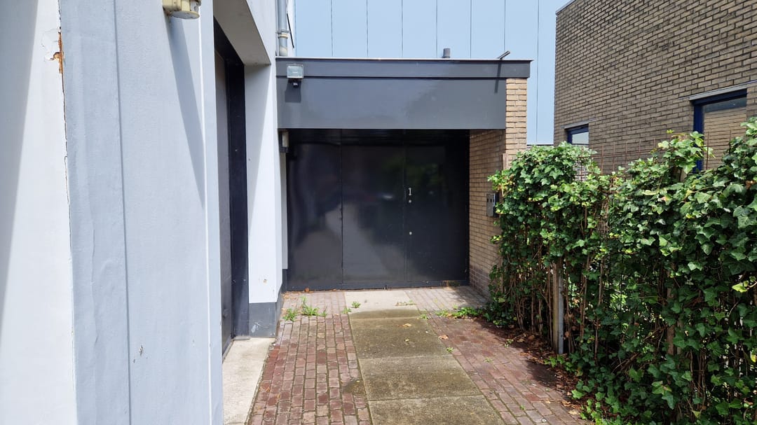De vooral voor opslag geschikte bedrijfshal ligt op de begane grond, is voorzien van stalen deuren.