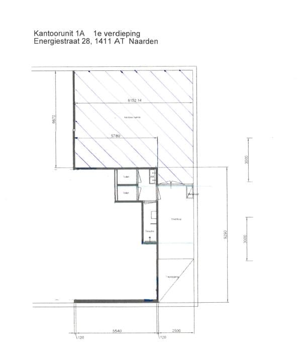 Kantoorunit 1A: circa 58 m² exclusief aandeel algemene ruimten.