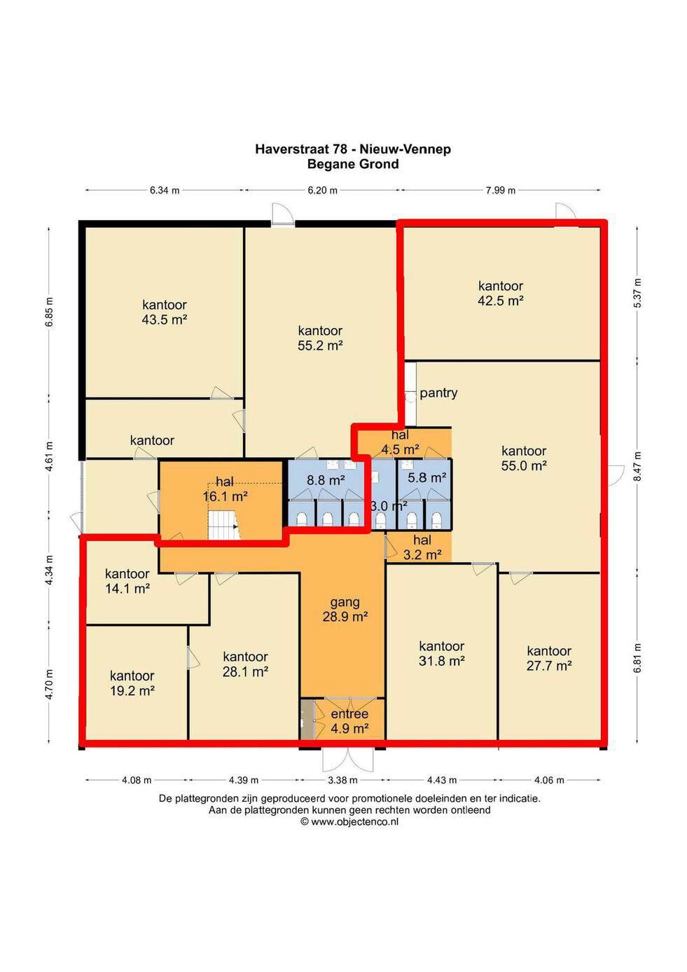 - entreehal aan de voorzijde van het object t.b.v. kantoorruimte op de begane grond;