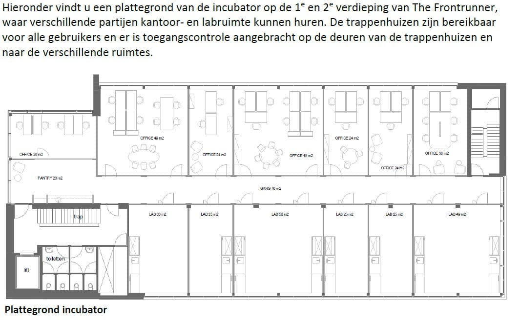 Omdat de Frontrunner een volledig nieuw te realiseren gebouw is, wordt deze casco+ opgeleverd aan de huurders. Op devoor verhuur beschikbare verdieping is 50% van het vloeroppervlak vrij in te delen als laboratorium of cleanroom. De installaties (waaronder luchtbehandelingskasten) zijn hierop voorbereid en hebben voldoende vermogen om de vrije indeling per verdieping te faciliteren.