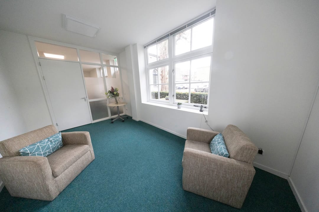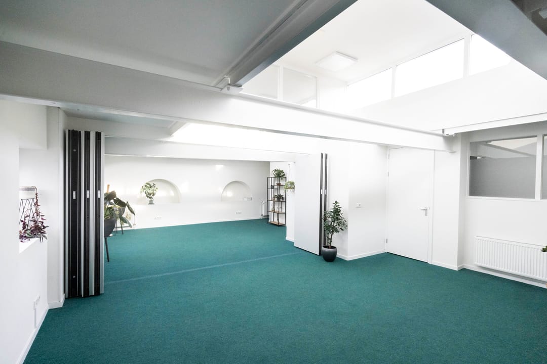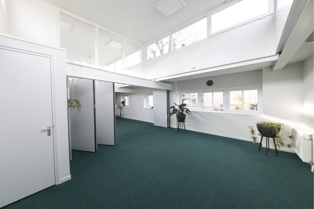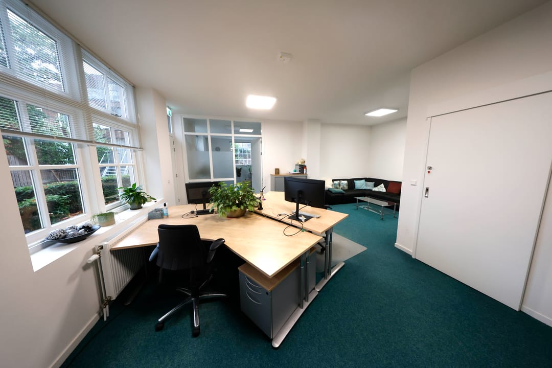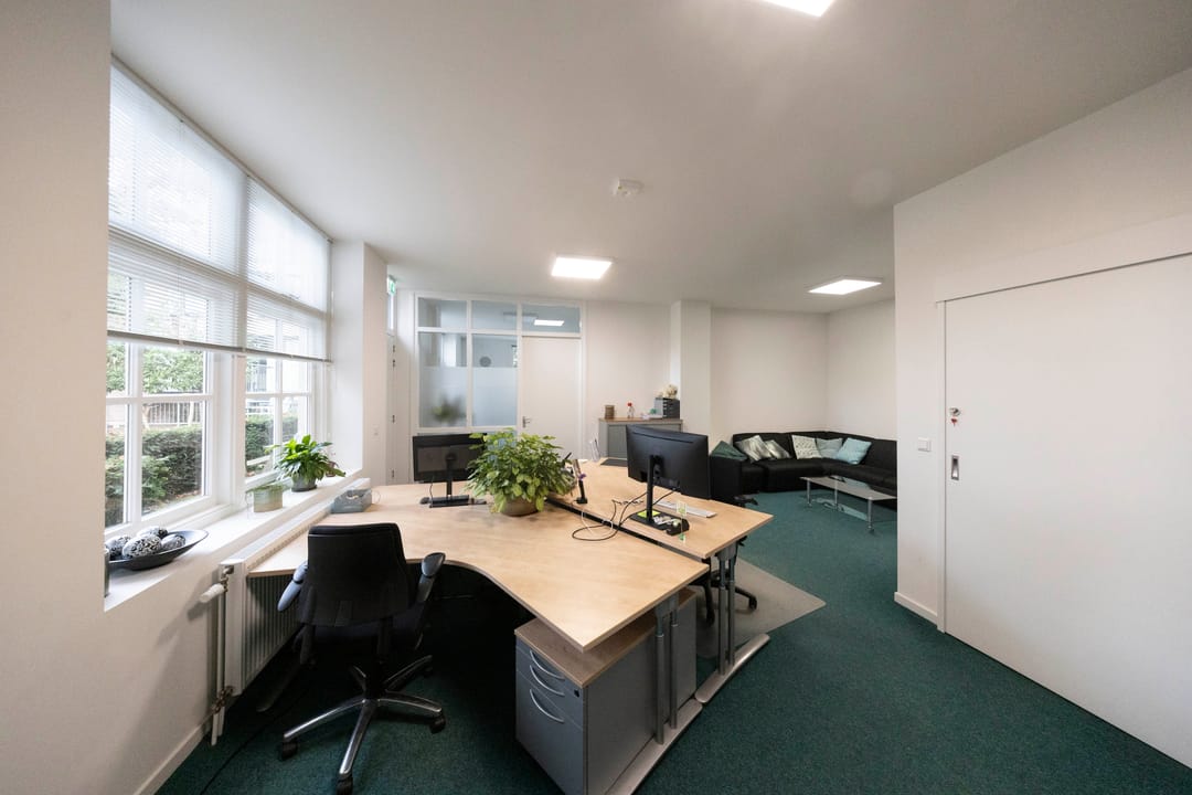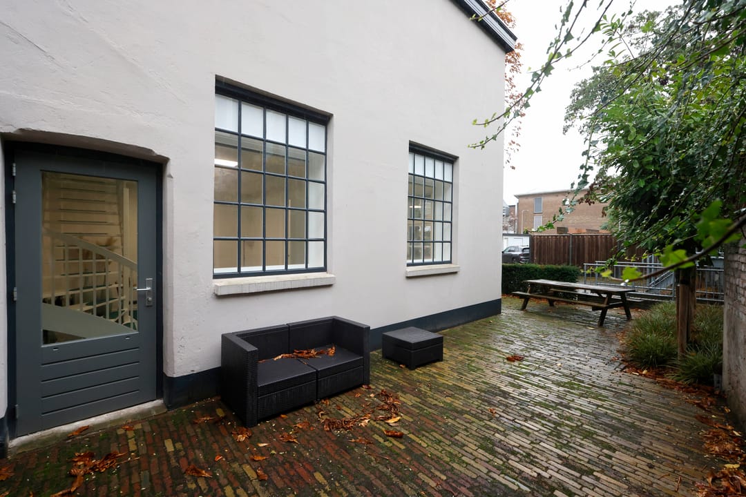 Op de eerste verdieping bevindt zich een royale pantry, voorzien van een comfortabele loungeruimte en een bibliotheek, wat bijdraagt aan een aangename werkomgeving. Vanuit de pantry is er toegang tot een kantoortuin met toiletruimte op de verdieping. Deze ruimte is flexibel in te delen en kan desgewenst worden opgesplitst in twee afzonderlijke kantoorruimten dankzij een mobiel wandsysteem. Ten slotte behoort een gedeelte van de binnenplaats tot het gehuurde, waardoor er tevens buitenruimte beschikbaar is voor bijvoorbeeld ontspanning of informele overlegmomenten.