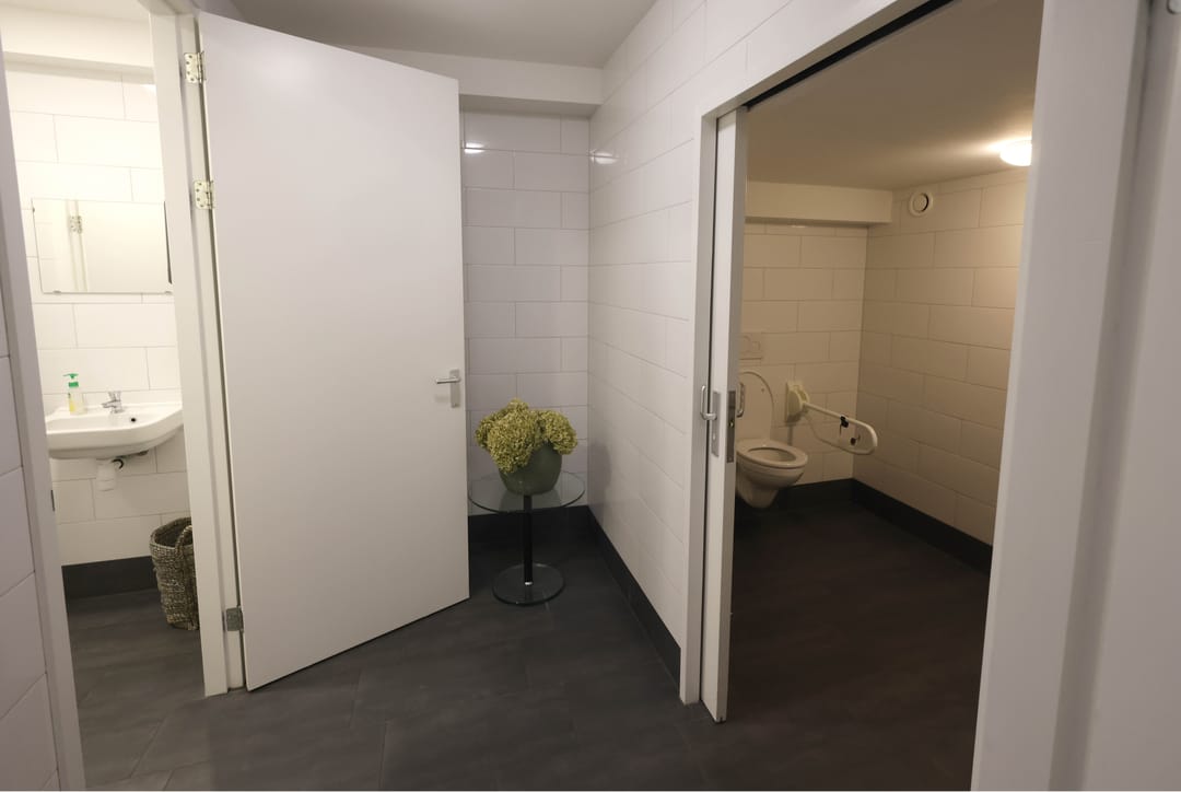 Bij binnenkomst treft u een entree die toegang geeft tot diverse voorzieningen. Direct bij de entree bevindt zich een toilet en een aparte technische ruimte. Via de gang bereikt u de garderobe en een praktische archiefruimte, ideaal voor het opbergen van documenten en materialen. Verder zijn er aparte dames-, heren- en mindervalidentoiletten (miva-toilet) aanwezig, waarmee het pand toegankelijk is voor iedereen.