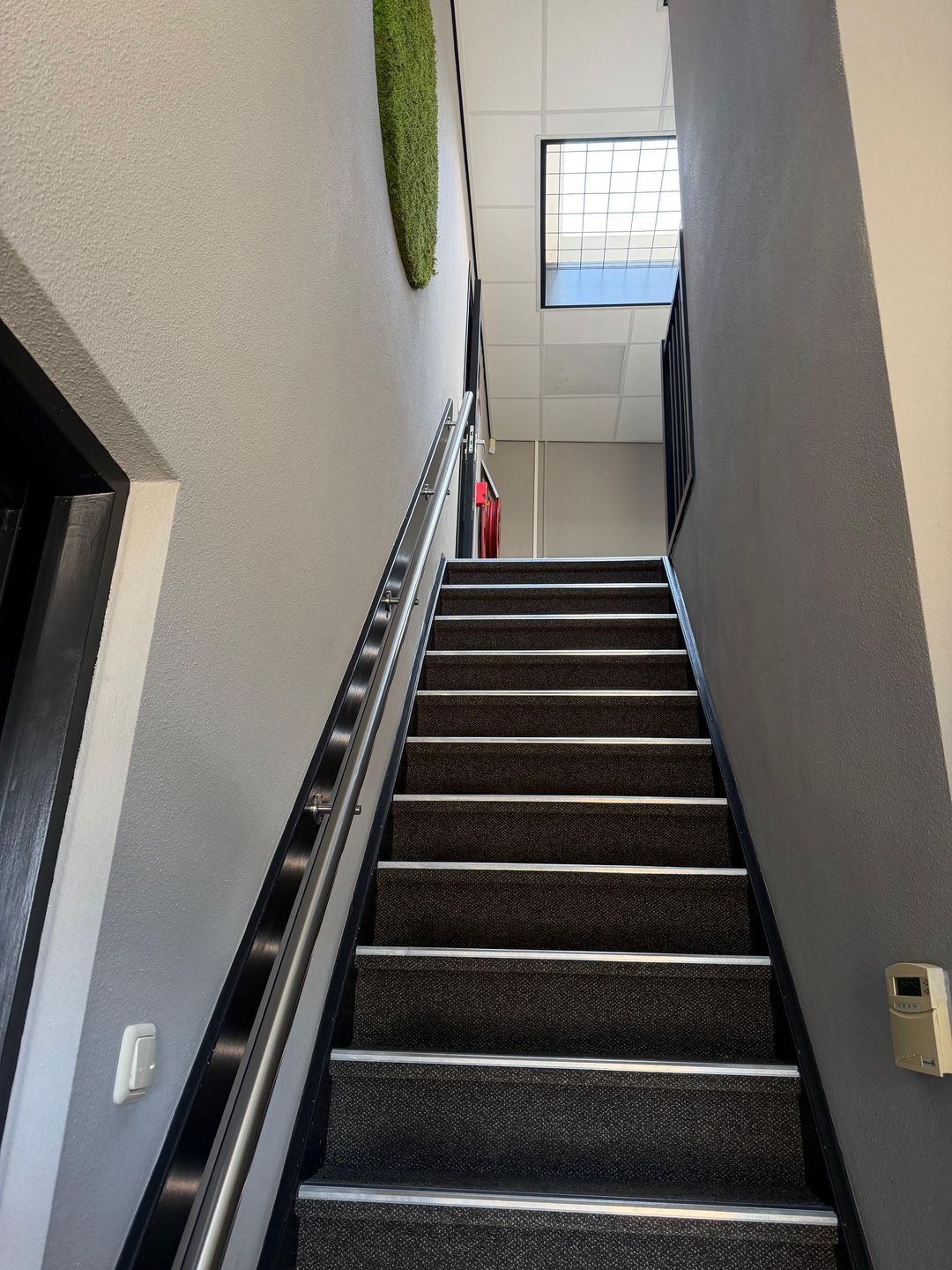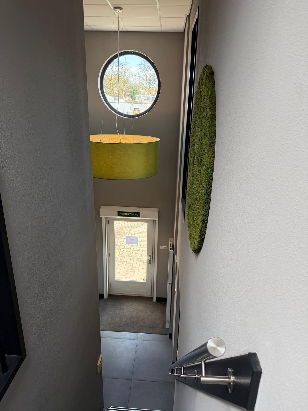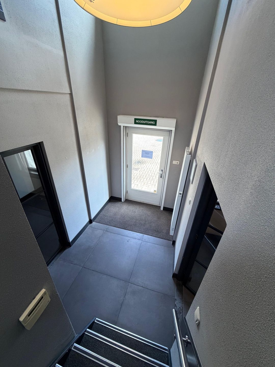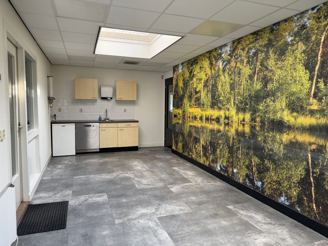 - Overloop, waaraan 2 ruime kantoren en de ruime kantine met keuken en zicht op de bedrijfsruimte