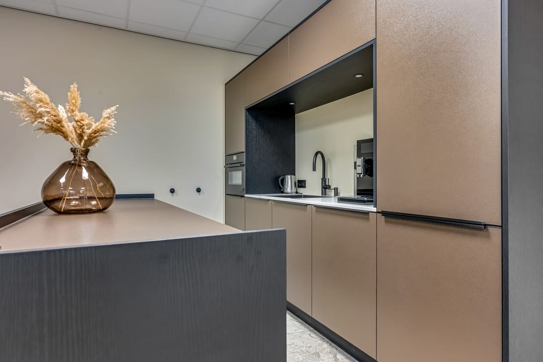 Koffiehoek met een luxe keuken en zithoek voor informele gesprekken en ontspanning.