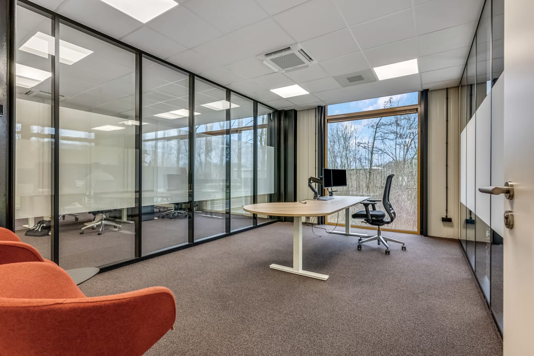 Twee gestoffeerde ruimtes, geschikt voor afspraken en vergaderingen. Dankzij het overvloedige daglicht kunnen deze ruimtes ook perfect dienen als showroom.