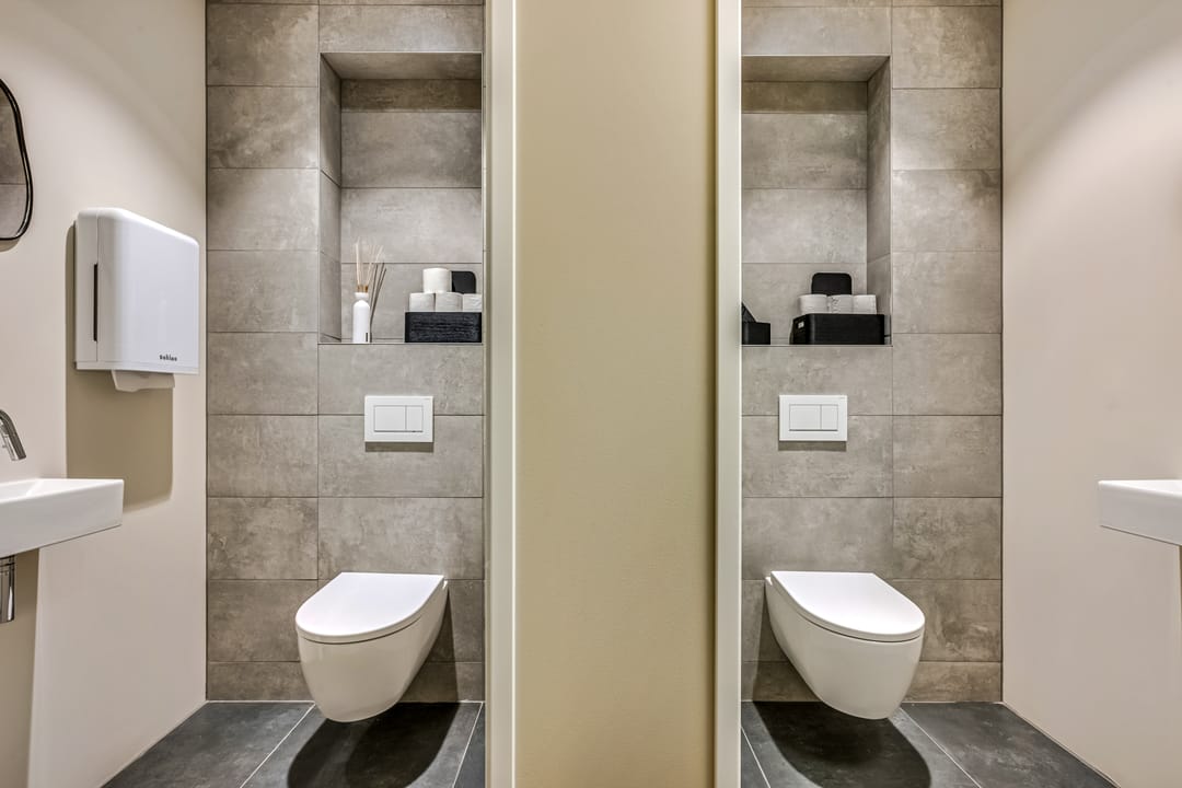 Ruime hal met trapopgang, 2 afgescheiden toiletten.