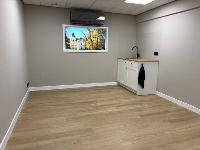- Inbouwarmaturen, kabelgoten, systeemplafond, toilet, pantry, verwarming en kamerindeling