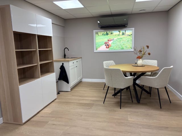 De gezamenlijke pauzeruimte, inclusief keuken bevindt zicht in het souterrain, evenals een apart toilet voor collega's.