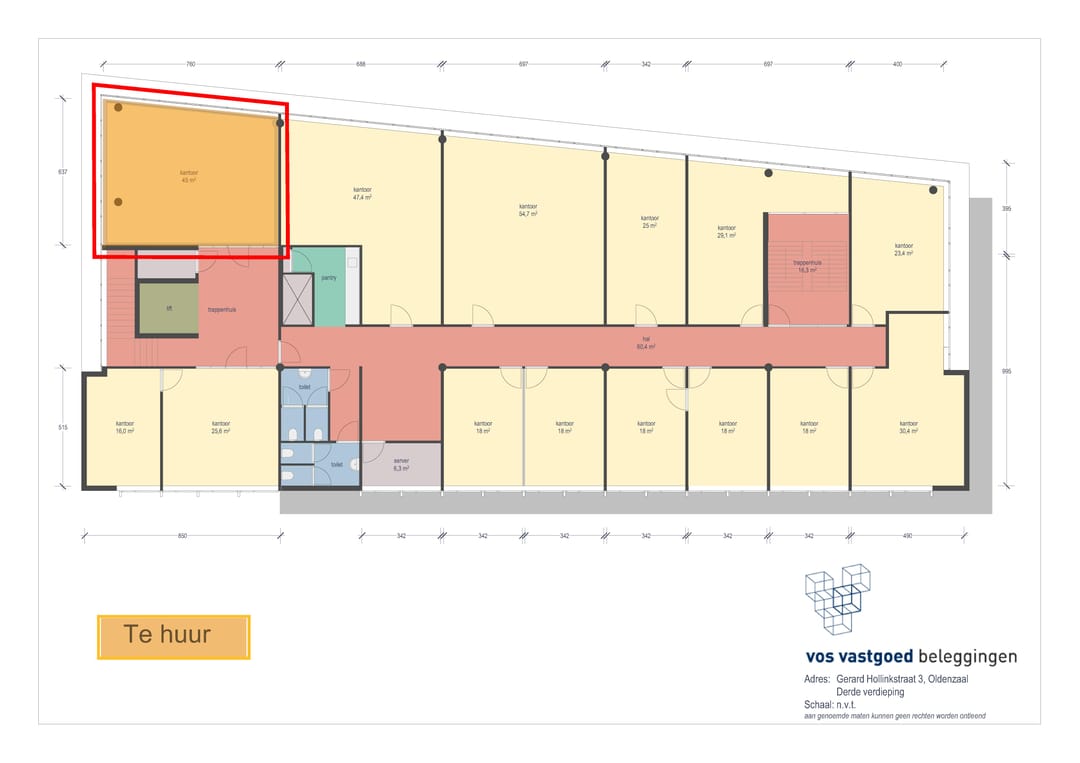De verhuurbare oppervlakte van het onderhavige object bedraagt circa 45 m² en is geheel gelegen op de derde verdieping: