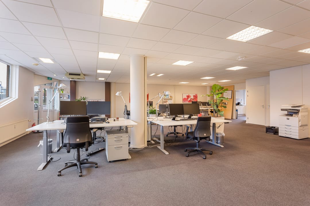 Open werkruimte met veel licht, een separaat kantoorruimte en twee extra werkplekken aan de achterzijde. Deze unit deelt de pantry en het sanitair met naastgelegen unit 2b (ca. 19 m2).