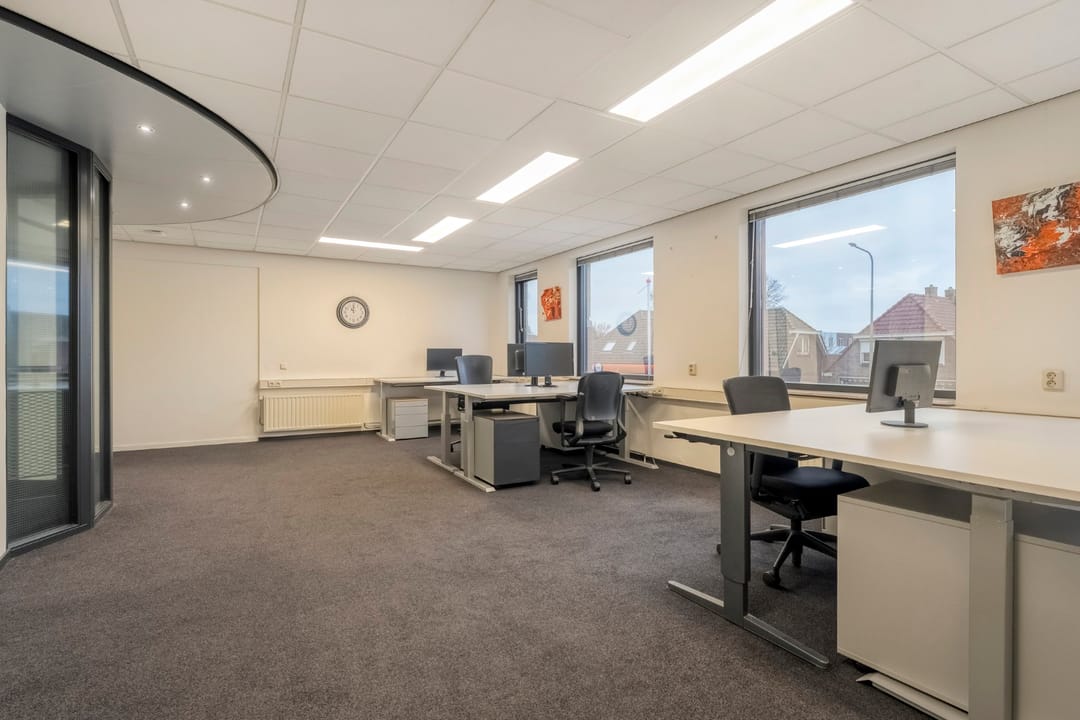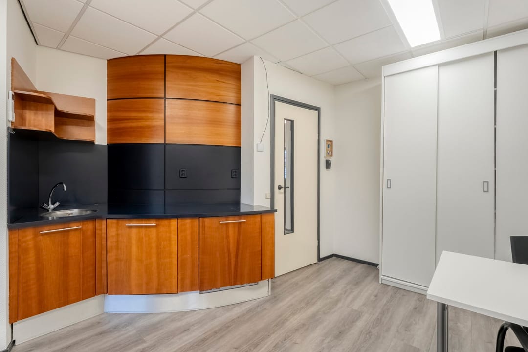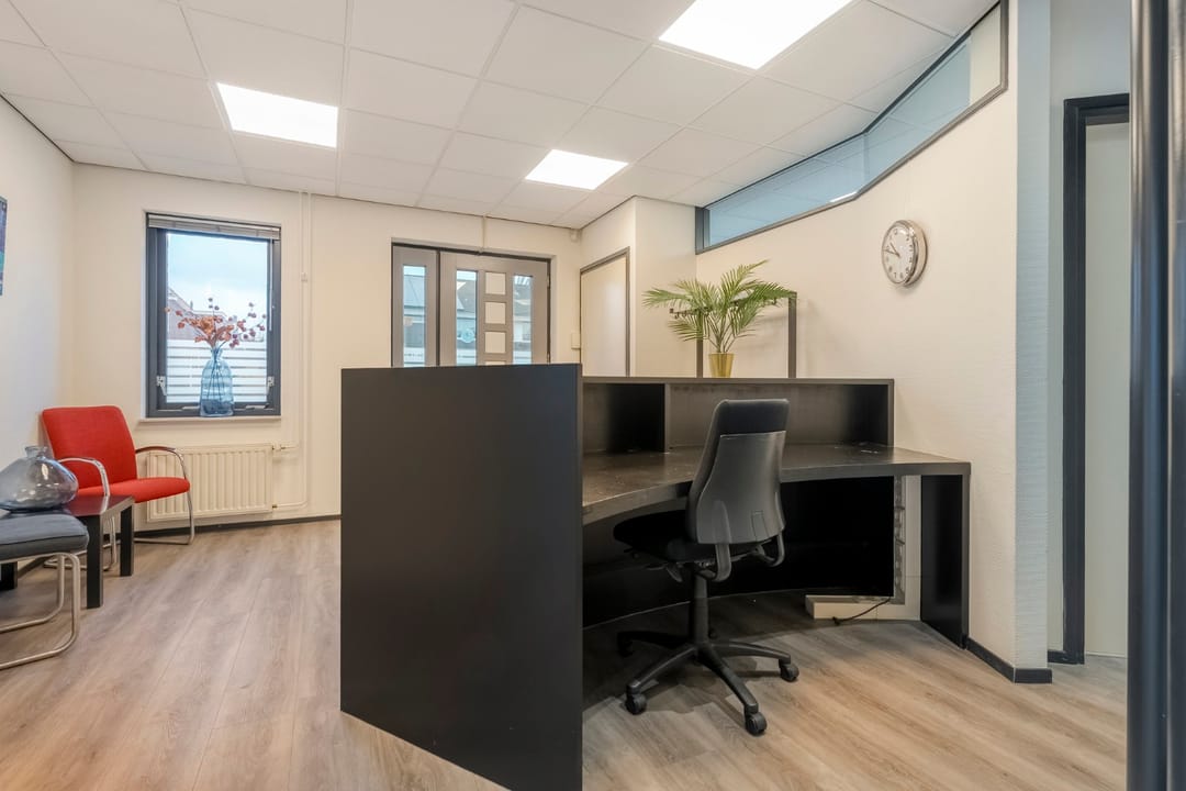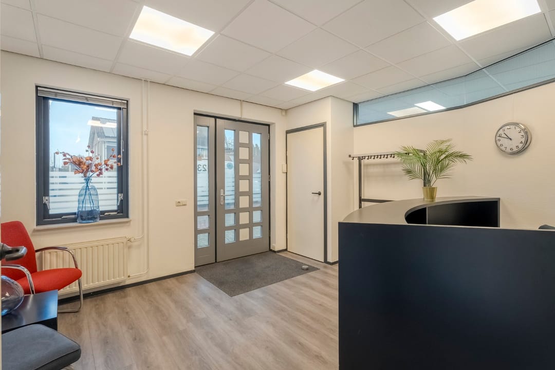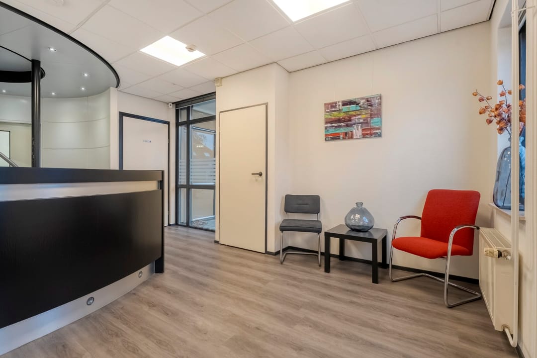 Ruime entree/wachtruimte met balie en garderobe, vaste kast, toiletruimte (toilet, urinoir en wastafel), 2 kantoorkamers en een vergader-/lunchruimte met pantry voorzien van enige inbouwapparatuur.
