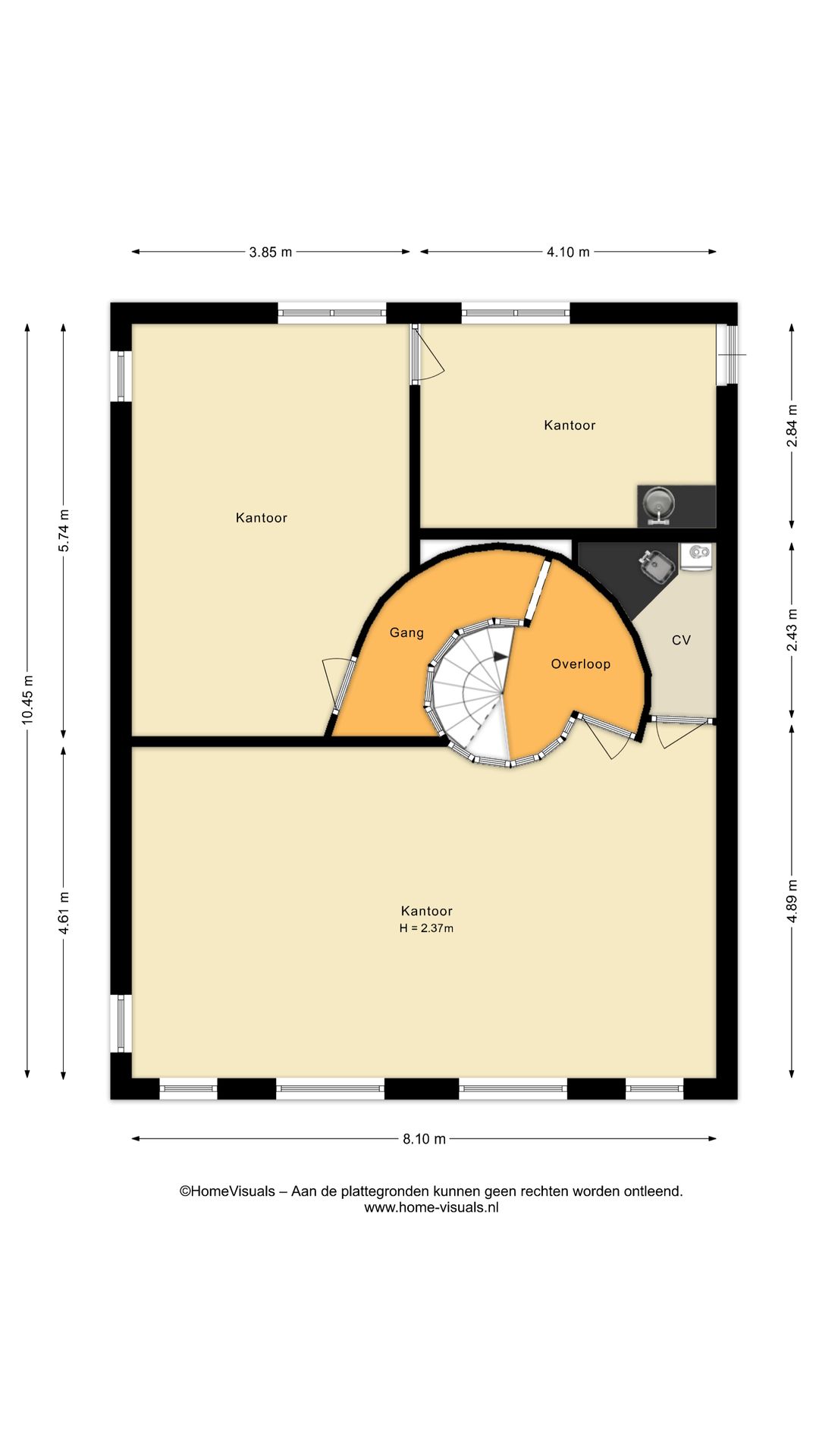 Overloop, 2 kantoorkamers, berging-/archiefruimte met eenvoudig keukenblokje en CV-kast met werkblad en gootsteen.