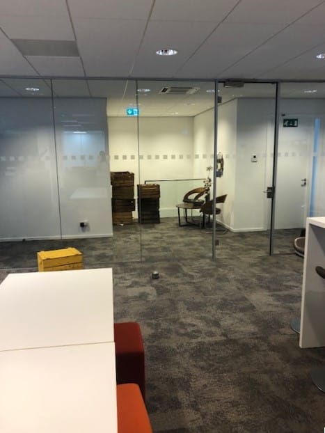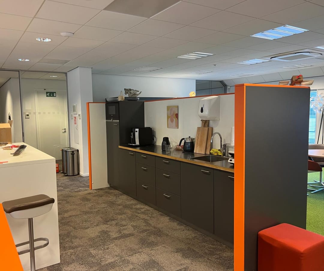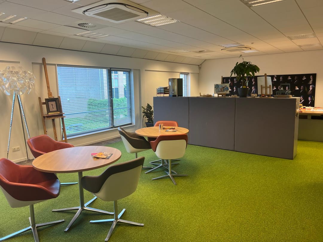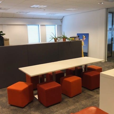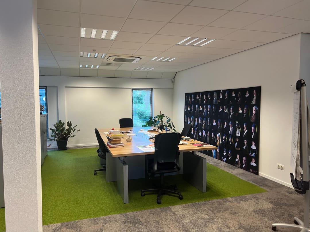 Gemeubileerd: De kantoorruimte is volledig ingericht met moderne meubels, inclusief bureaus, stoelen, opbergkasten en gebruik van een vergaderruimte.