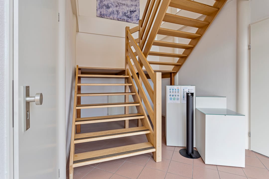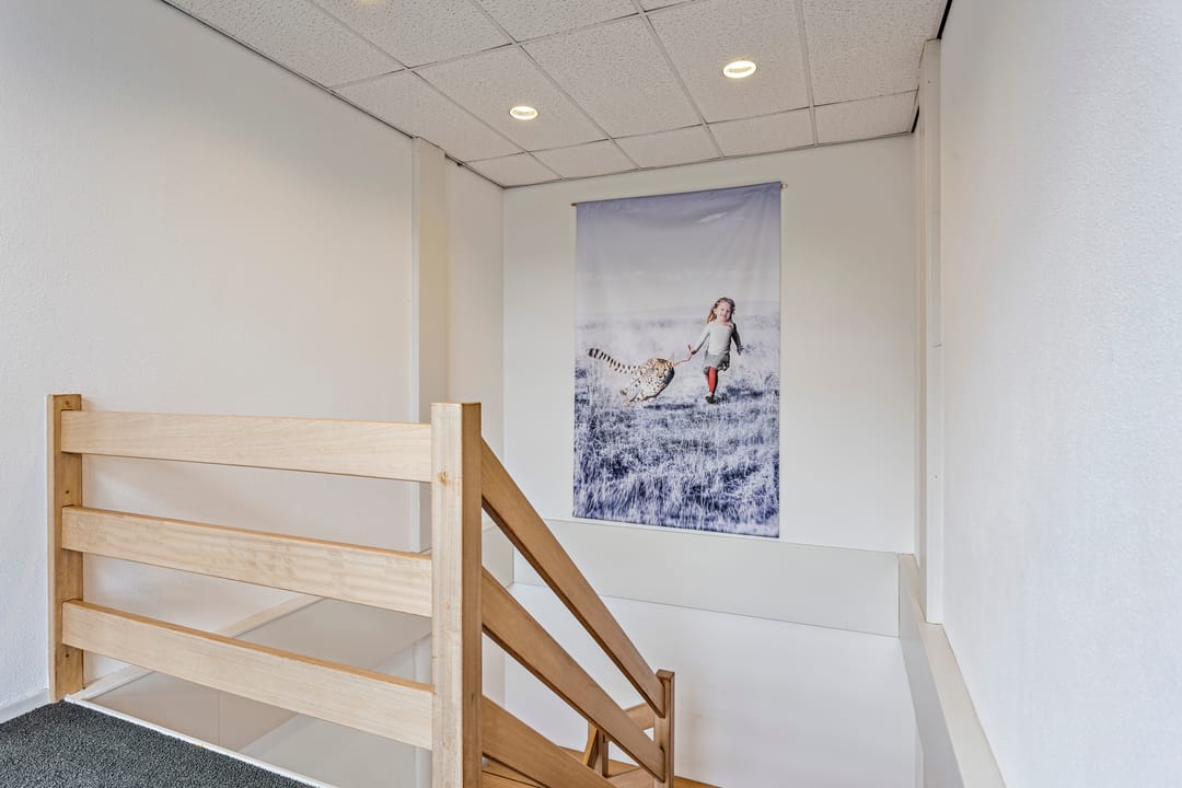 De trapopgang bevindt zich aan de voorzijde van het object waardoor direct de verdieping bereikt kan worden. De verdieping is middels het trapportaal in twee kantoordelen opgedeeld, waarbij zich aan de achterzijde twee ruime vergaderruimten en een serverruimte bevinden.