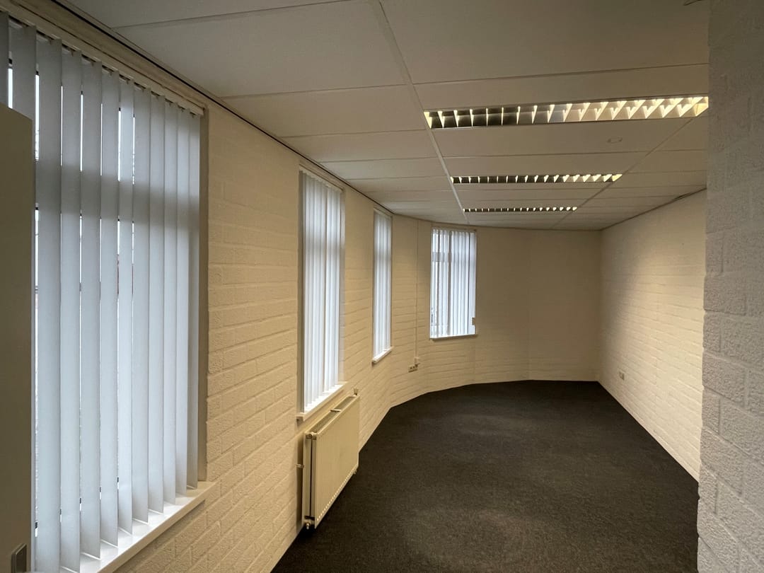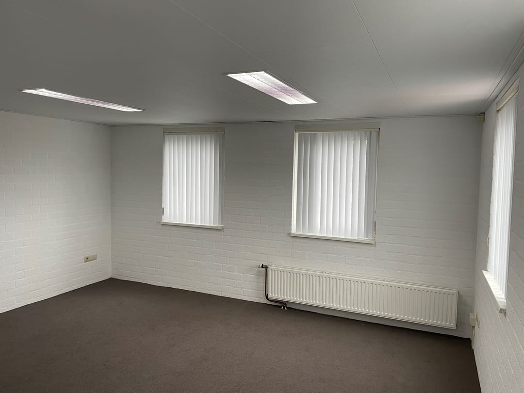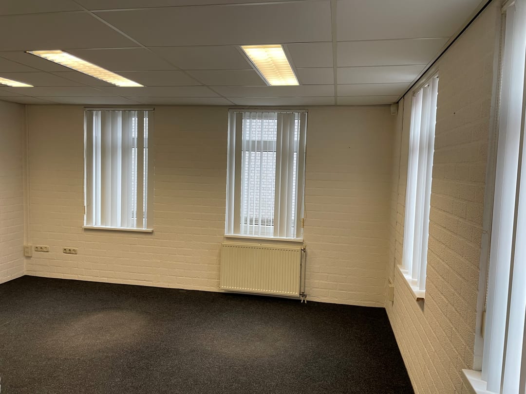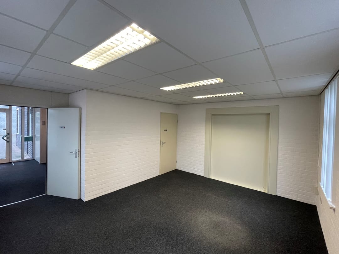 Het kantoor/showroom is voorzien van een kunststof pui met loopdeur. Kozijnen van het kantoor/showroom zijn van kunststof en voorzien van dubbele beglazing. De entree en twee kantoren/werkruimtes zijn voorzien van een vloertapijt en systeemplafonds met lichtbakken. Het kantoor en de wachtruimte is voorzien van een vloertapijt.