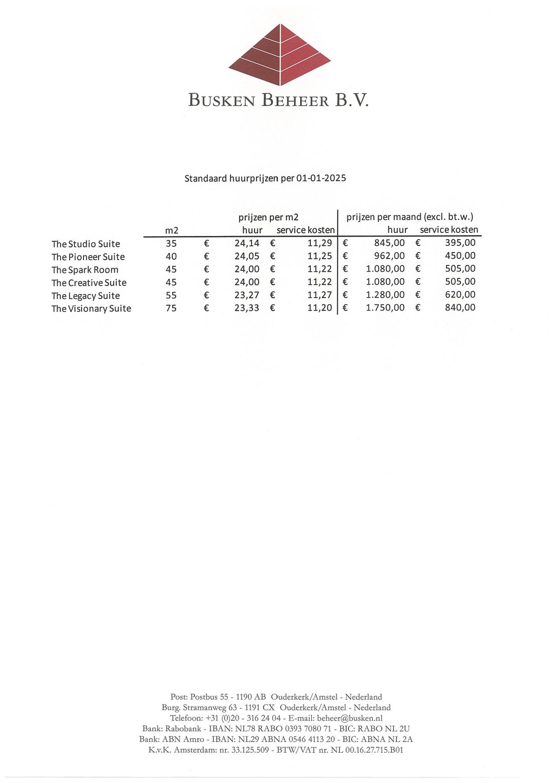 Voor een overzicht van de beschikbare ruimtes, m2 en prijzen verwijzen we jullie naar de afbeeldingen.