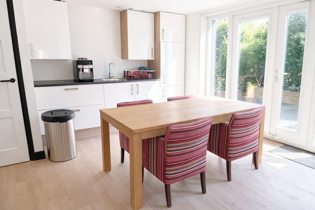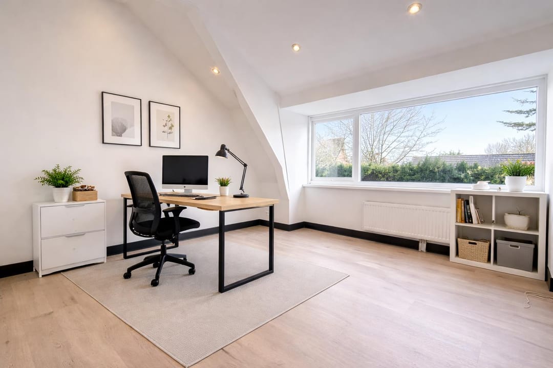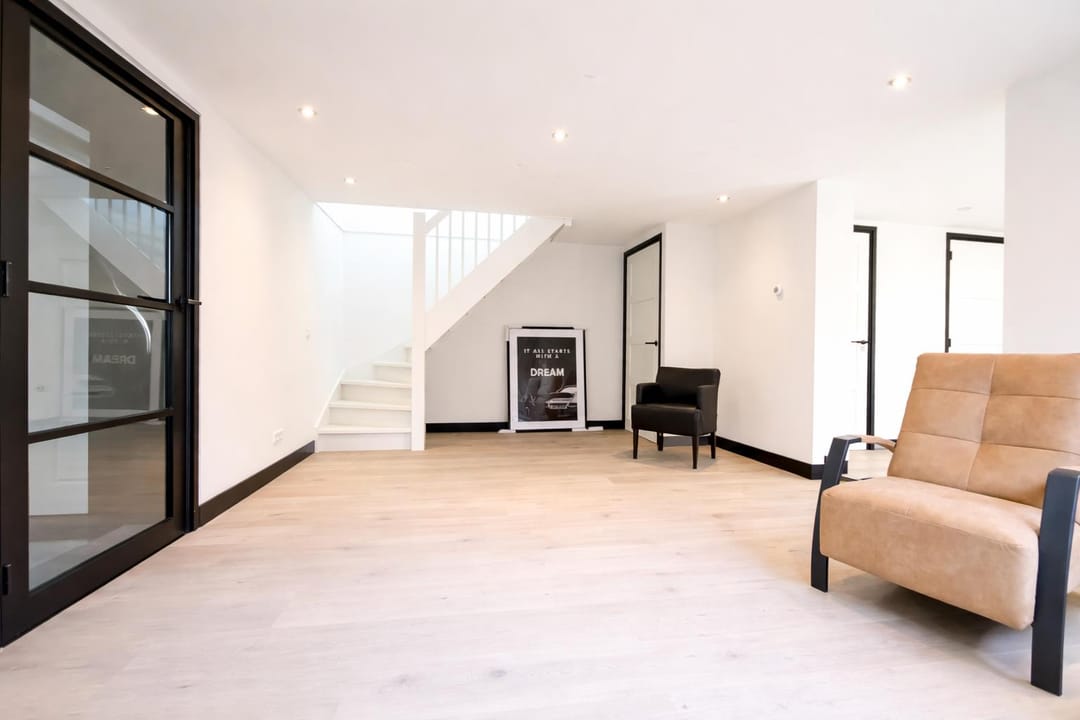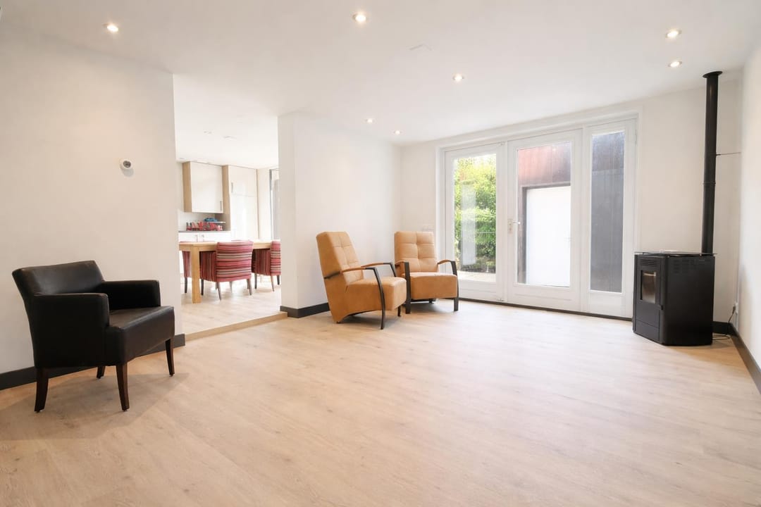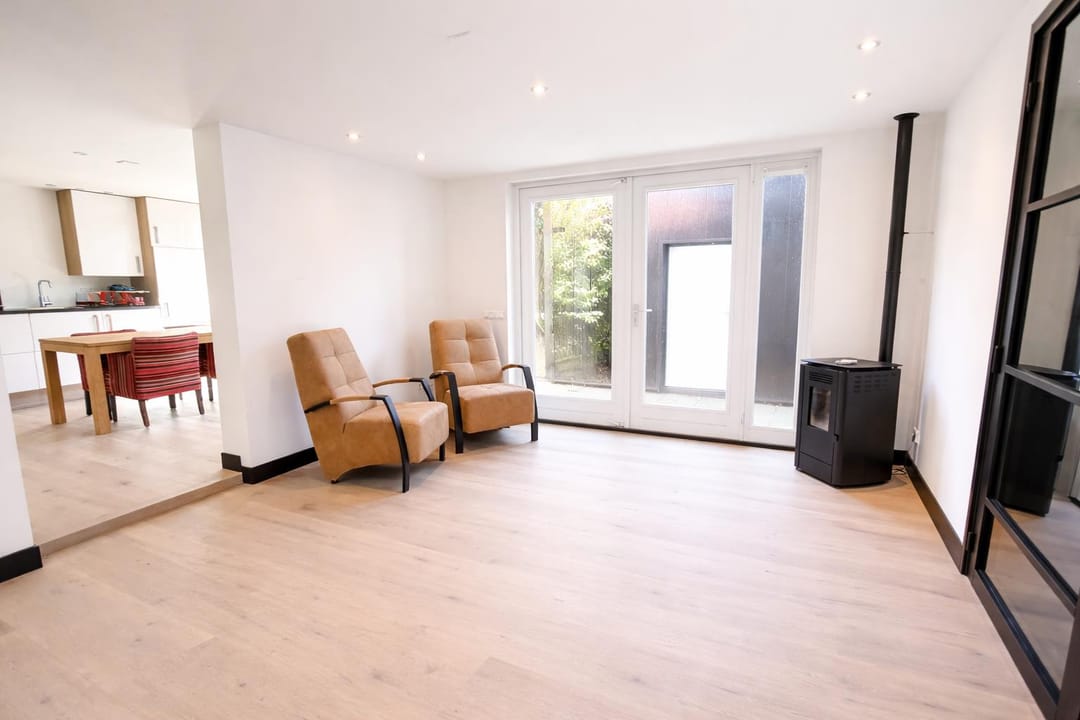 De tweede kantoorruimte is modern, representatief en praktisch ingedeeld, ideaal voor bijvoorbeeld een praktijk, kantoor of atelier. Vanuit de garage is deze topruimte bereikbaar. Op de begane grond bevindt zich een ruim zitgedeelte met vloerverwarming, een sfeervolle pelletkachel en openslaande tuindeuren naar buiten. De ruimte is afgewerkt met een luxe PVC vloer en een verlaagd plafond met inbouwspots, wat zorgt voor een moderne uitstraling.