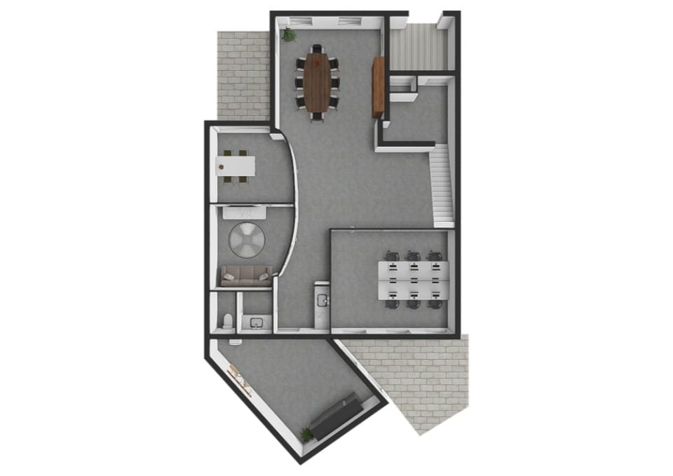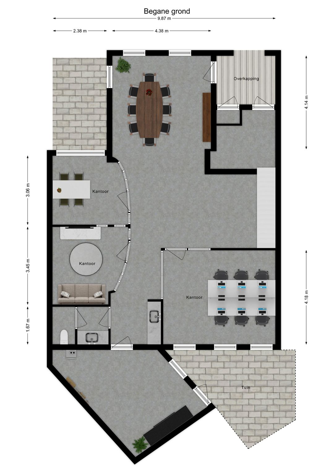 • Begane Grond (ca. 125 m²): Professionele kantoorruimte met drie separate kantoren, centrale ruimte, kantine, keukentje, toiletgroep en een besloten binnentuin. Direct leeg en beschikbaar.