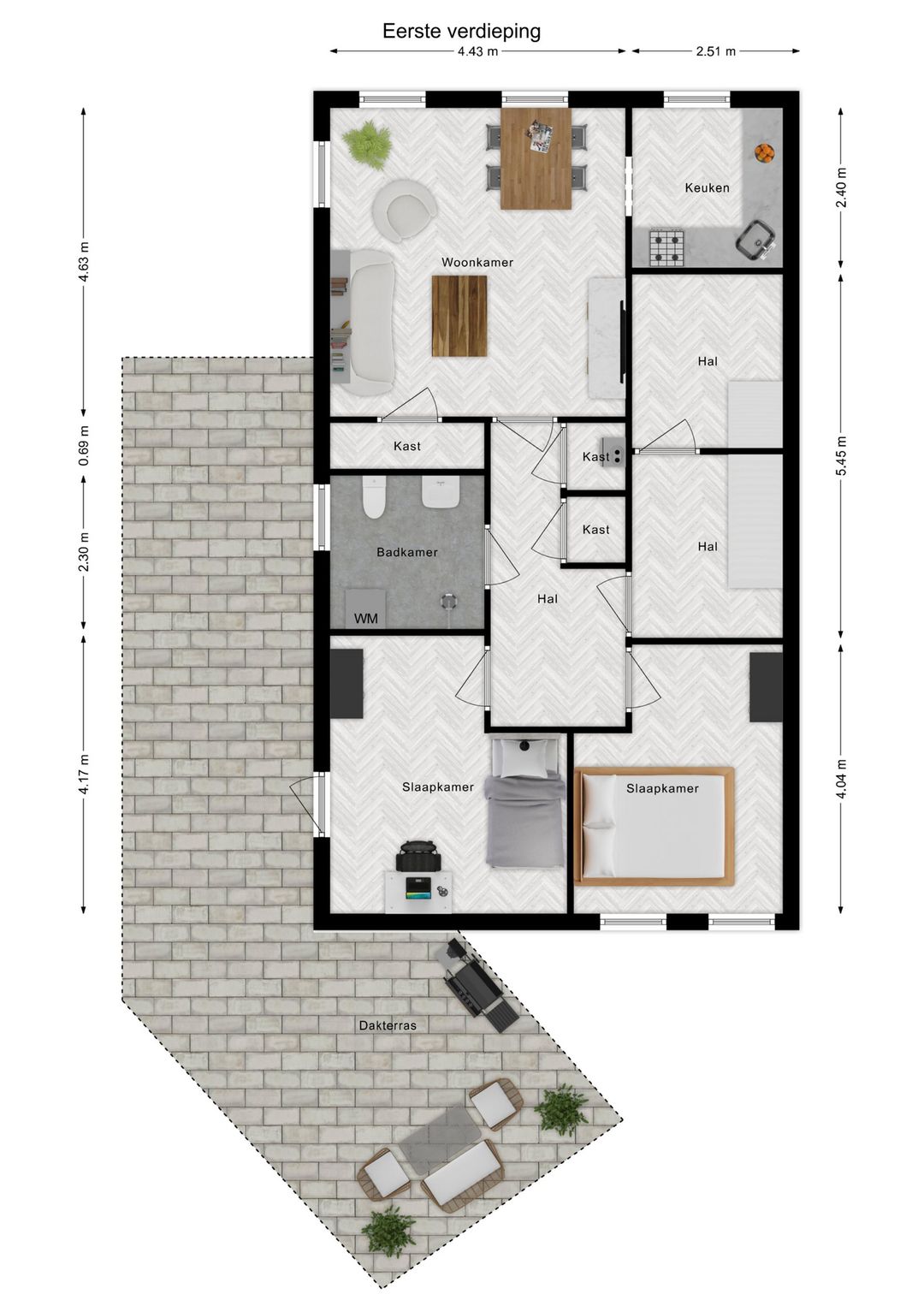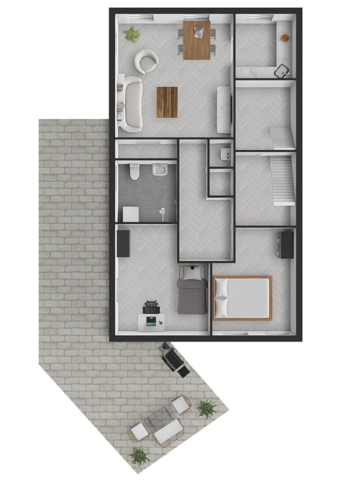 • 1e Verdieping (ca. 80 m²): Woonunit, reeds langdurig verhuurd (direct rendement) met dakterras.