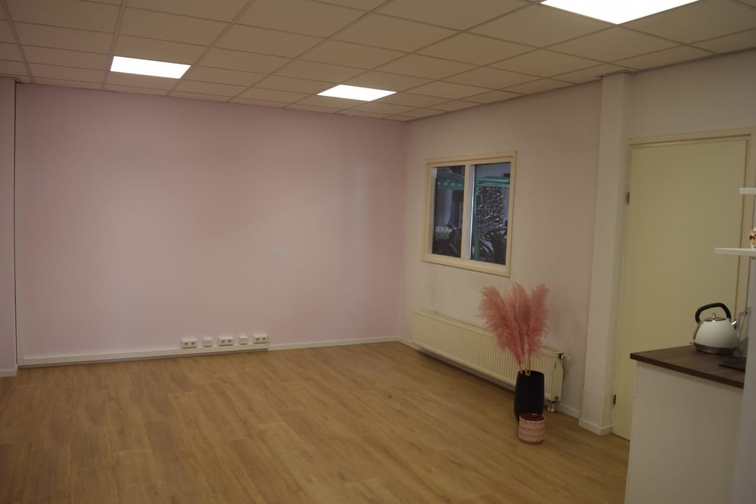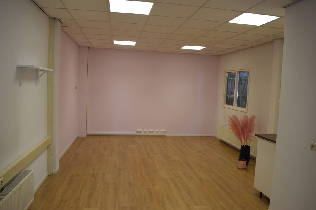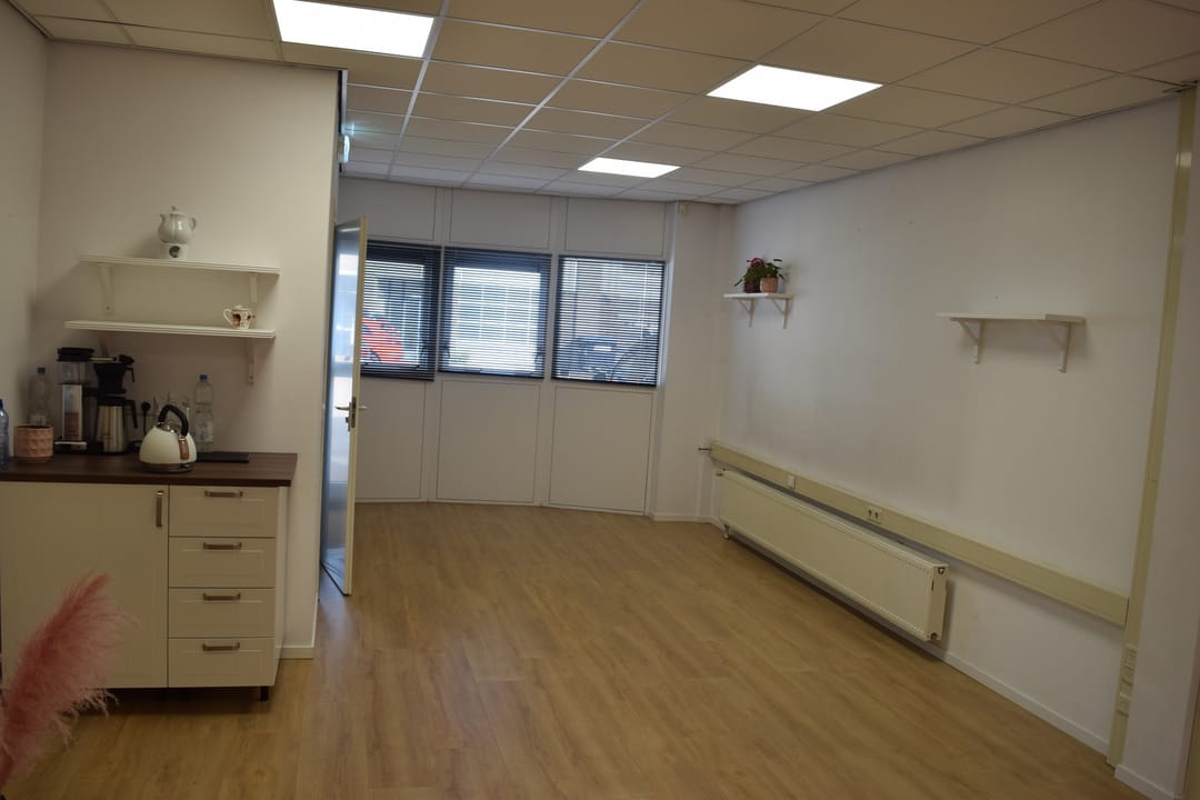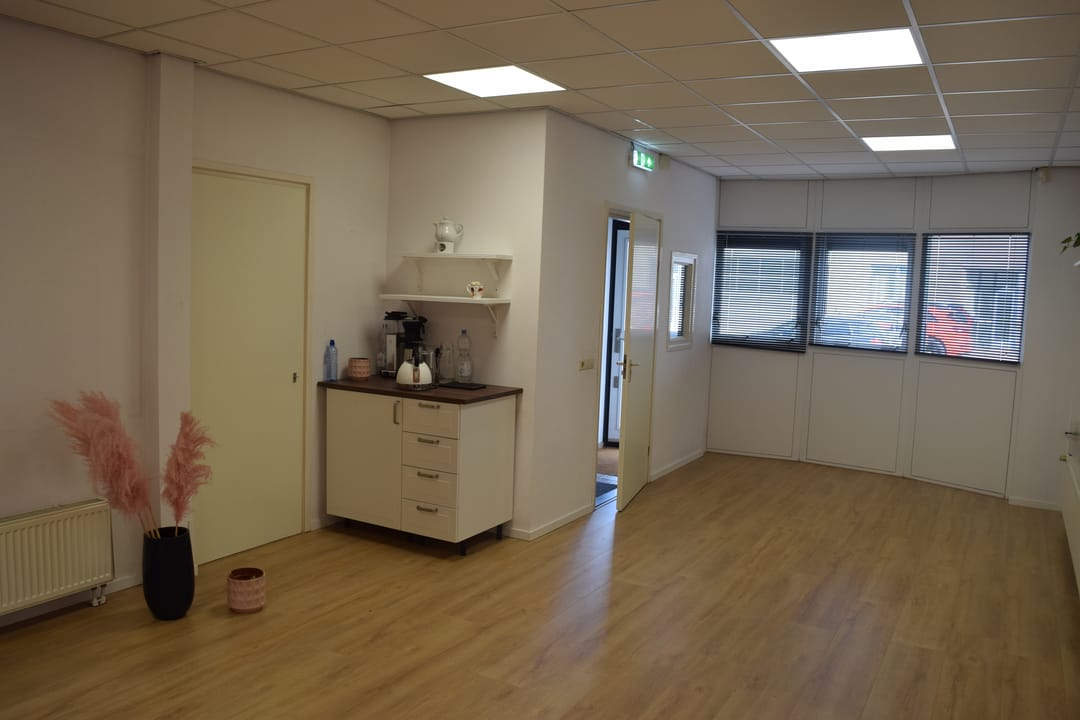 Ruime kantoorruimte ca. 50m2 voorzien van systeemplafond met LED verlichting en laminaat vloerafwerking. Ruime kitchenette met wasbak, vaatwasser, koelkast en voldoende bergruimte. Inpandige berging/archiefruimte gelegen aan de achterzijde en voorzien van c.v. combiketel (2022), toiletruimte met toilet en fontein.