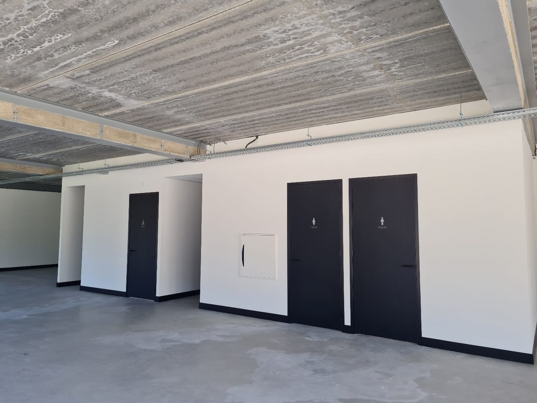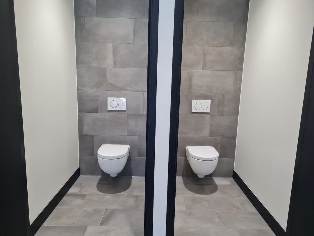<li>De natte ruimtes zijn volledig afgewerkt opgeleverd (2x dames, 2x heren, 1x invalide toilet),</li>