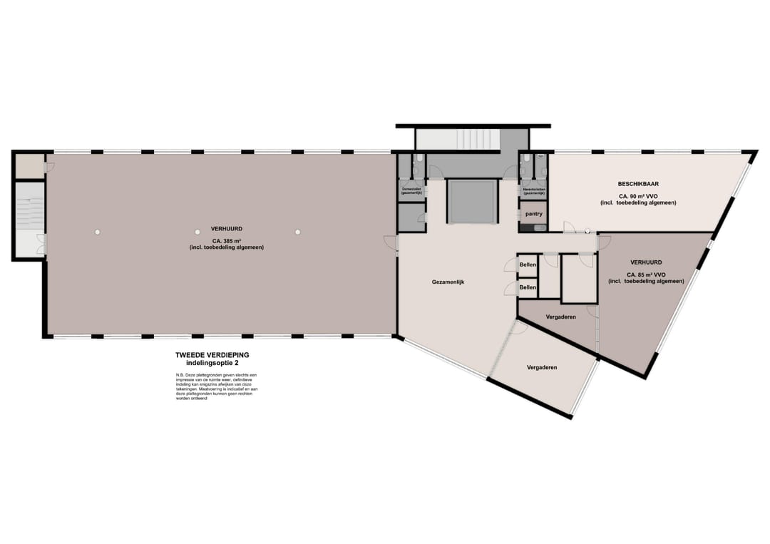 Unit van 90 m²: € 1.250 per maand excl. servicekosten en BTW.