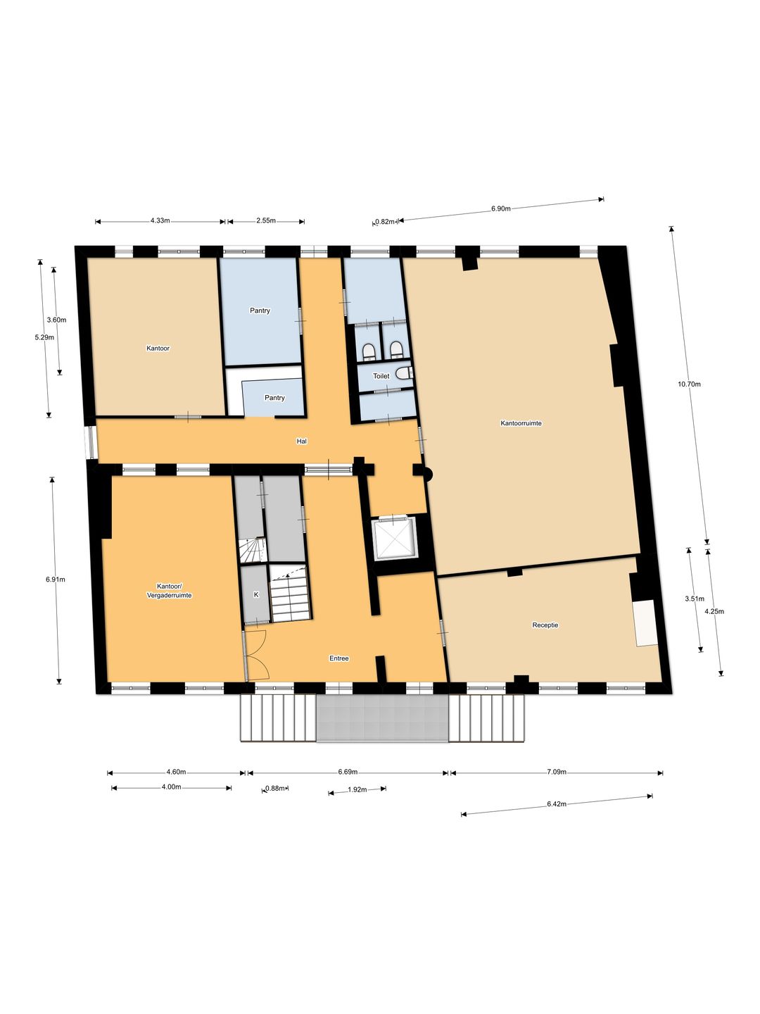 Meerder kantoorruimtes, spreekkamers, pantry, toiletten en achteruitgang.