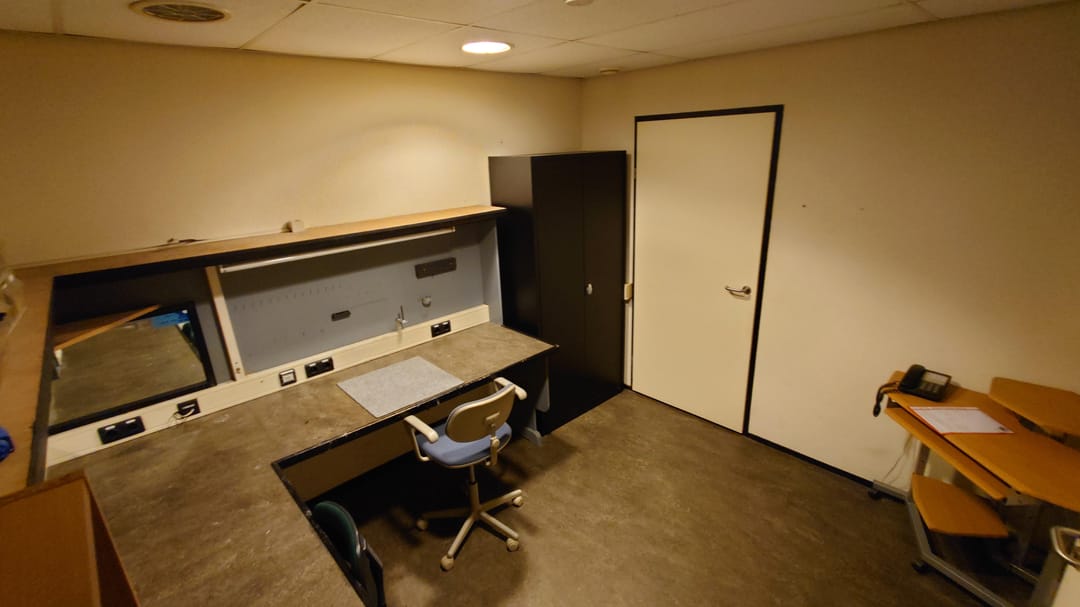 De indrukwekkende studio/hal heeft een hoogte van ca. 6 meter en is volledig geluidsarm dankzij de 40 cm dikke G4-constructie en hoogwaardige isolatie.