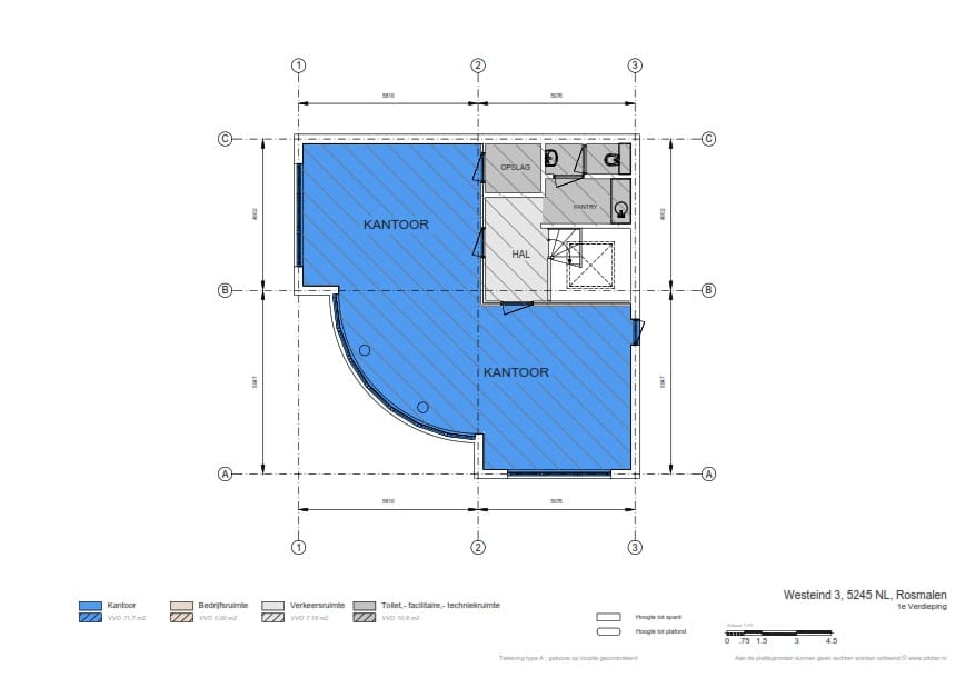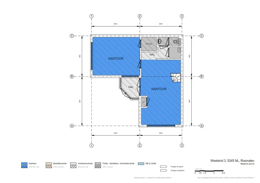 De kantoorruimte is verdeeld over twee bouwlagen. De begane grond beschikt over circa 82 m² kantoorruimte en op de eerste verdieping is circa 95 m² gelegen.