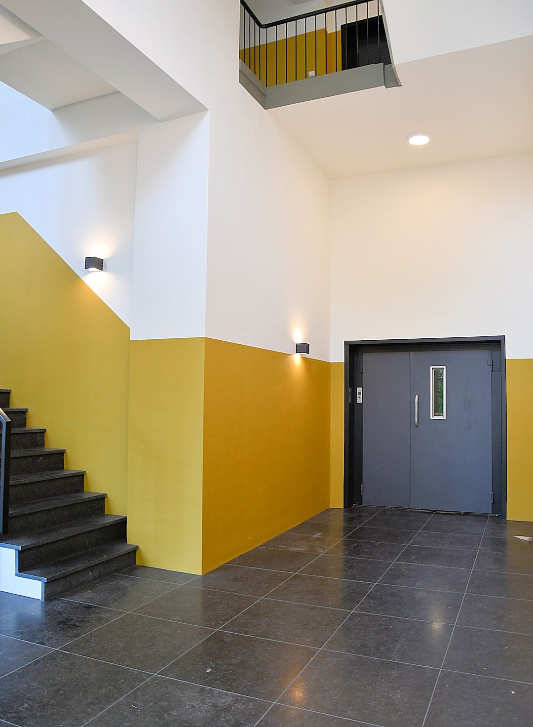 afgesloten centrale entree met videofoon en brievenbussen, grandioze hall met vide en natuurstenen vloer, fraaie verlichting en grote (goederen)lift alsmede mooi trappenhuis,
