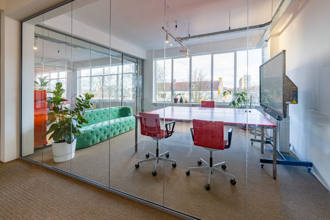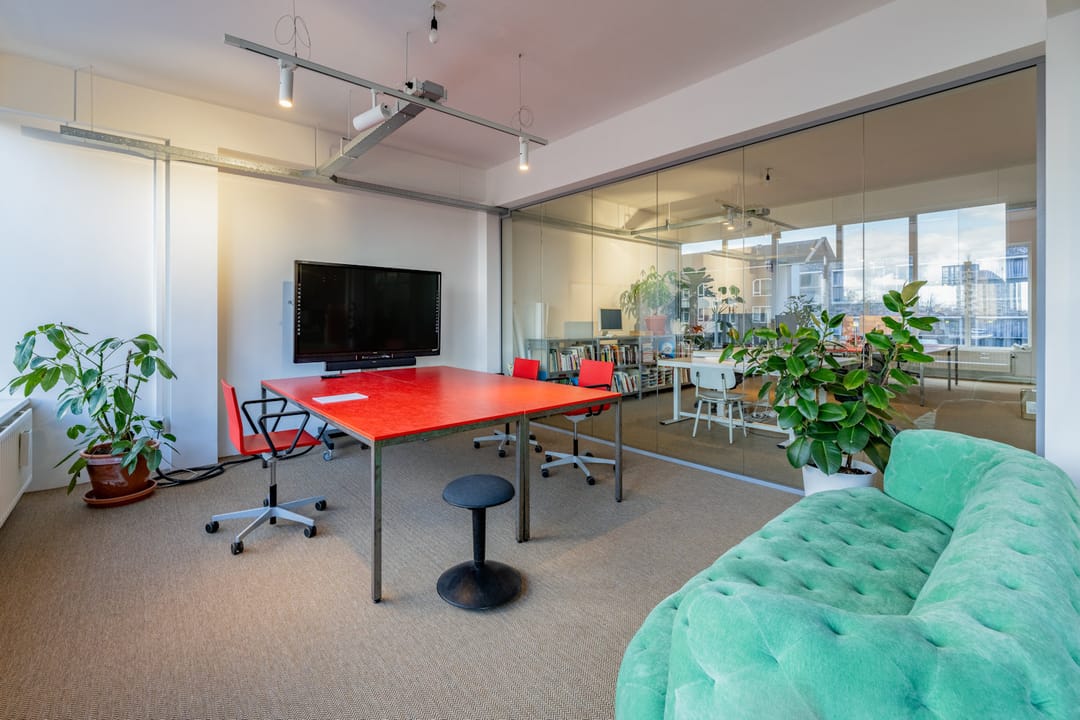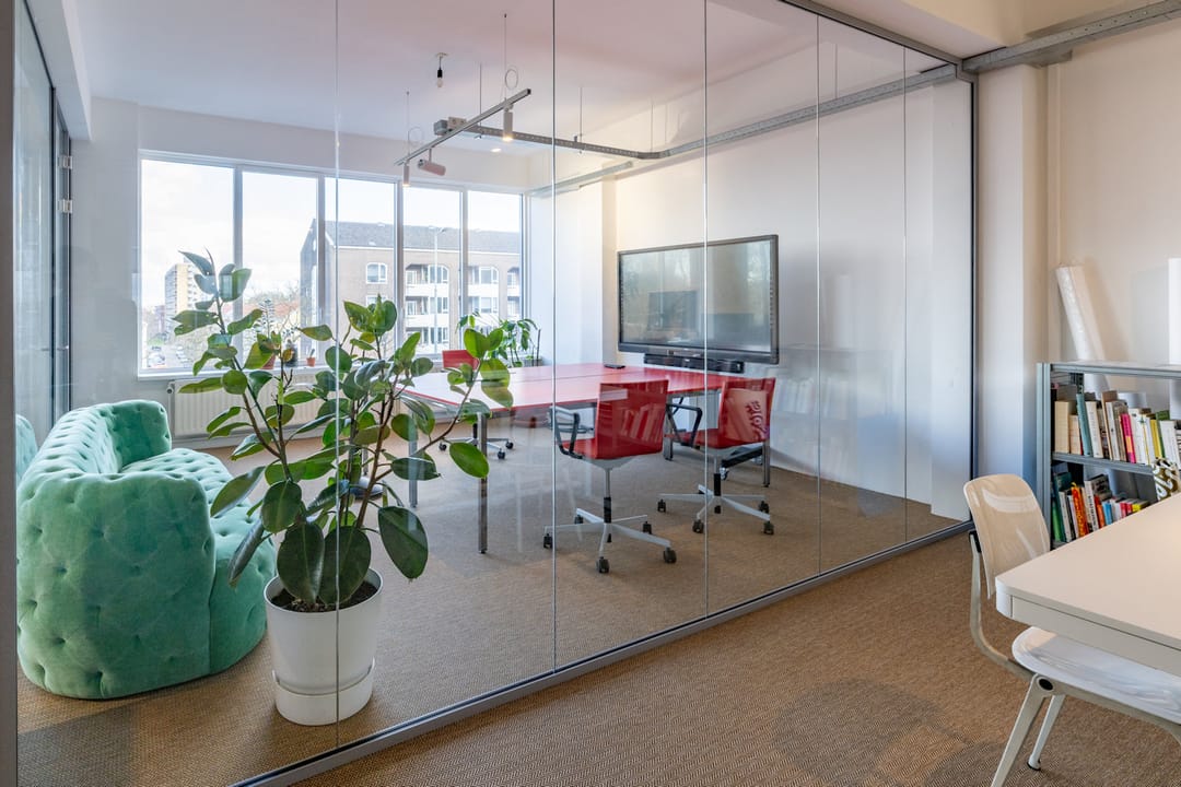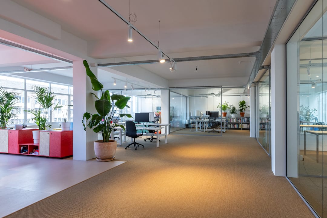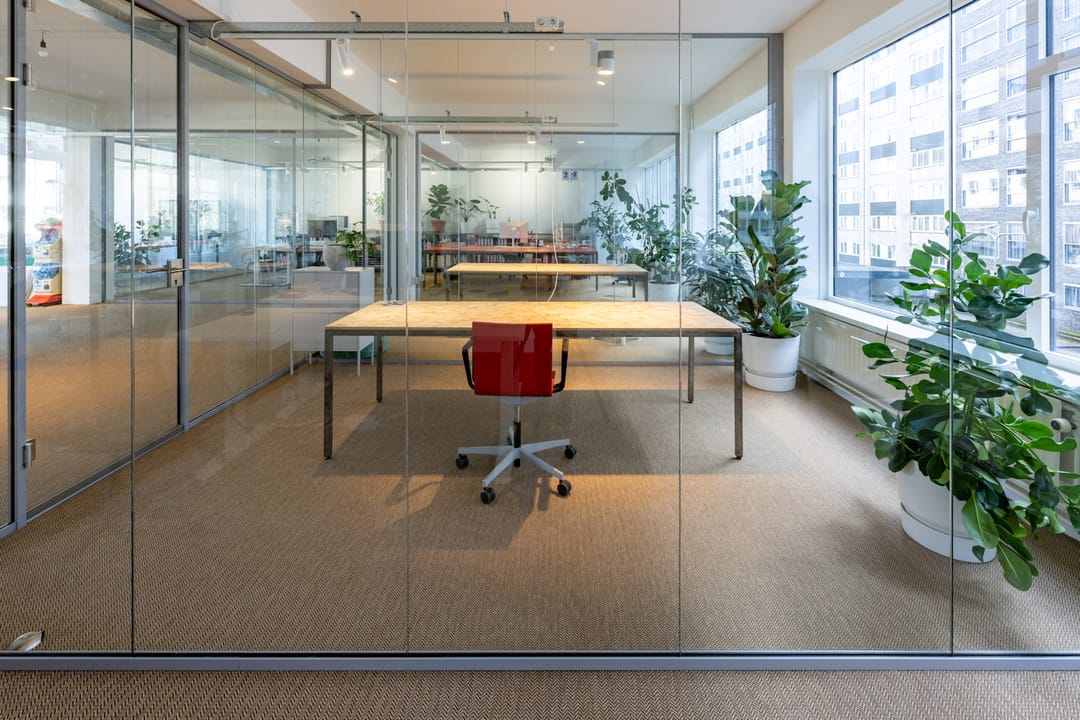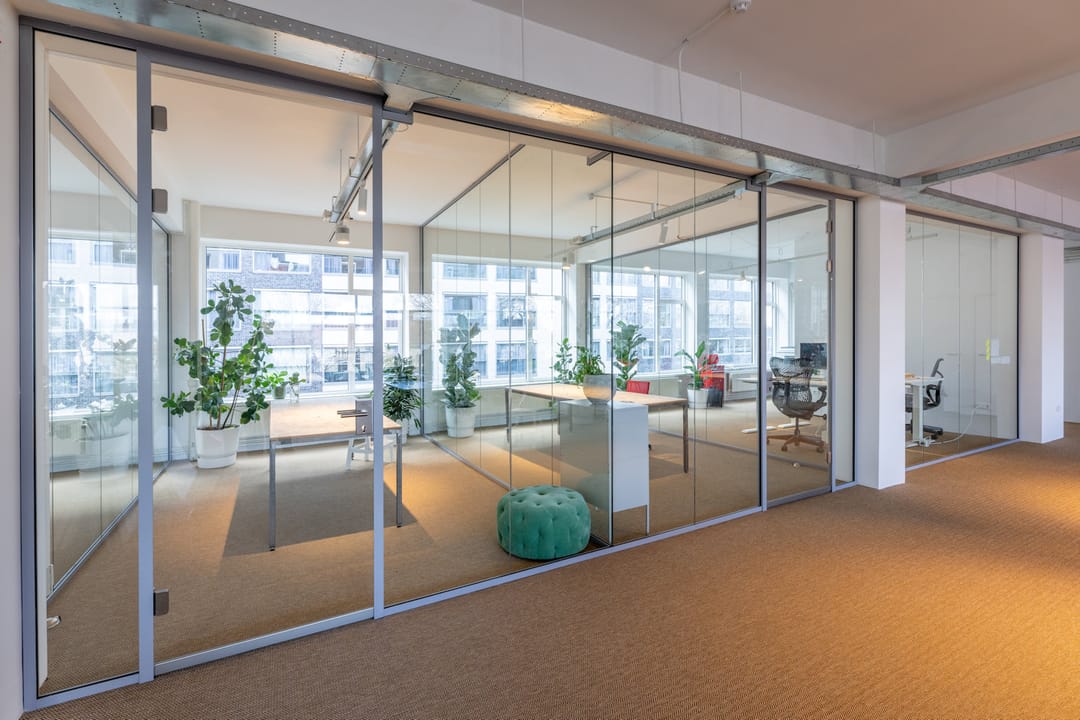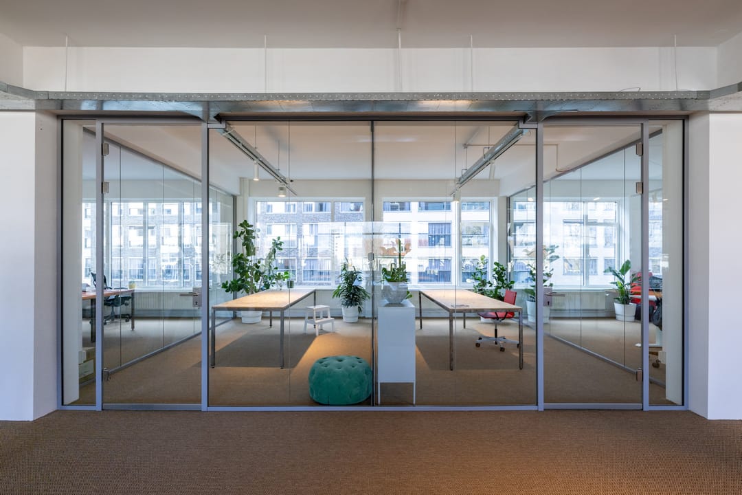 middels glazen scheidingswanden gecreëerde diverse werkkamers, alsmede grote open werkruimte.