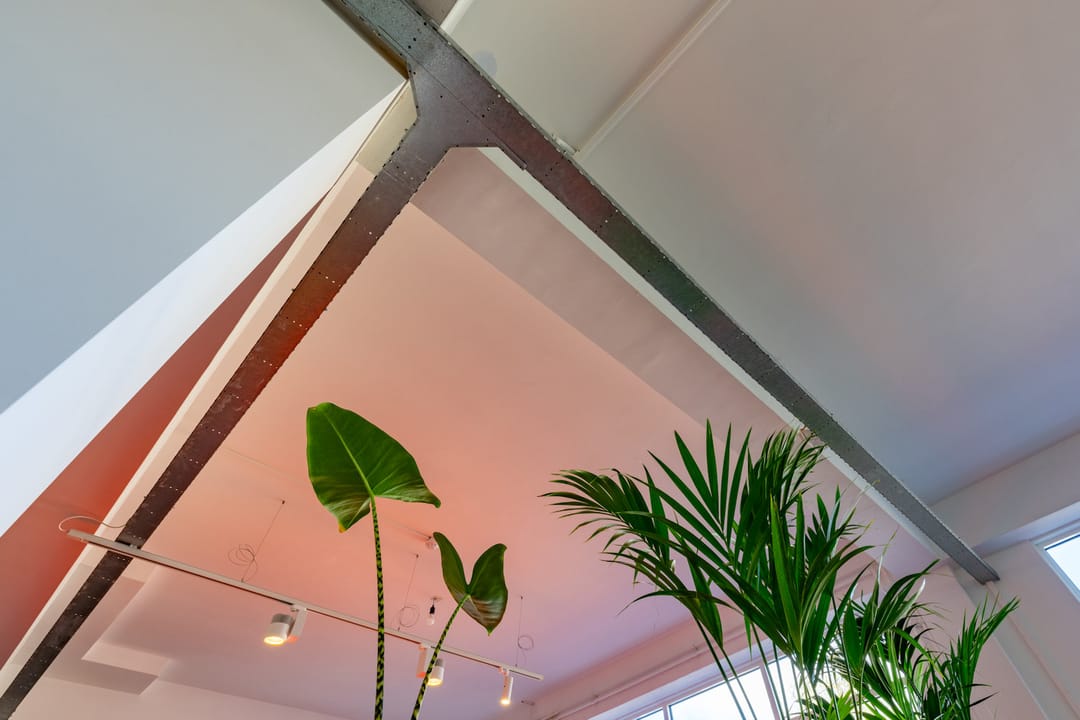 2. gestucte wanden en plafonds, met de industriële betonconstructie in het zicht