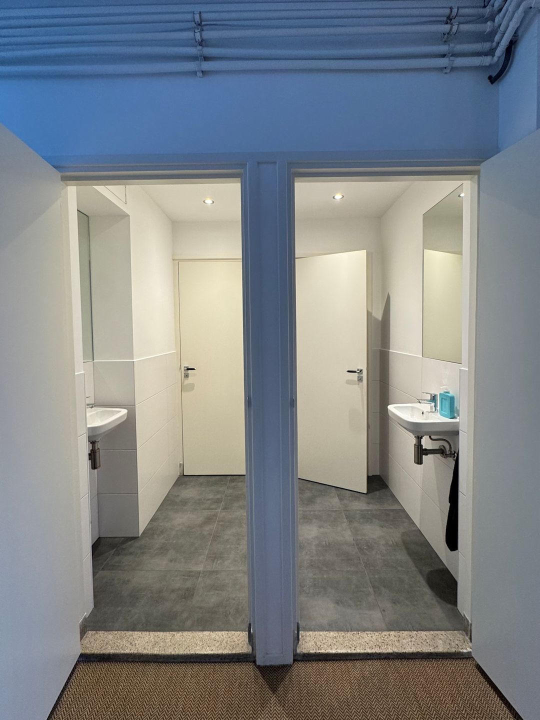 6. twee nieuwe toiletten met hangclosets, mech. ventilatie, wastafel en inbouwspots
