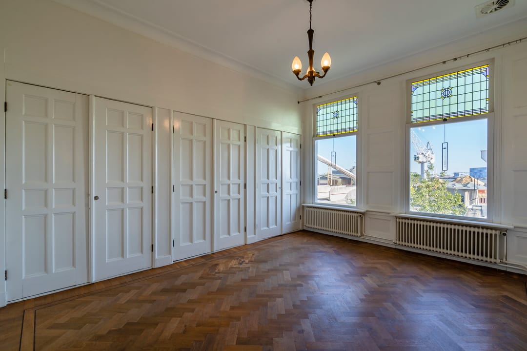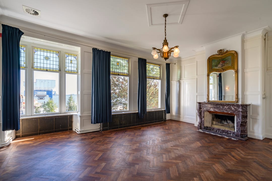 Kantoorruimte van 244 m² in de karakteristieke witte villa aan de Schaardijk 434 in Rotterdam. De villa, gebouwd in 1890 en in 2011 gerenoveerd met behoud van haar authentieke details, wordt volledig omringd door een groene tuin.