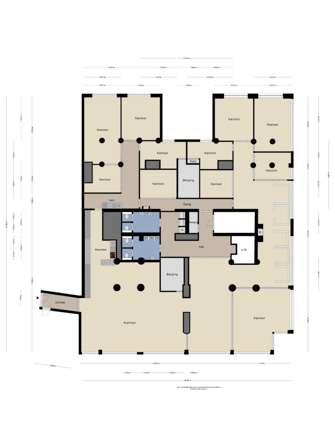 - Airconditioning, mechanische ventilatie, inbouwarmaturen, liften, te openen ramen, kabelgoten, systeemplafond, toilet, pantry, verwarming en kamerindeling