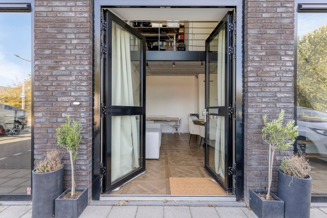 Begane grond: Ruime entree met veel lichtinval dankzij grote raampartijen, open kantoor-/werkruimte met moderne keuken voorzien van inbouwapparatuur. De hoge plafonds en het strakke afwerkingsniveau zorgen voor een lichte en professionele uitstraling.
