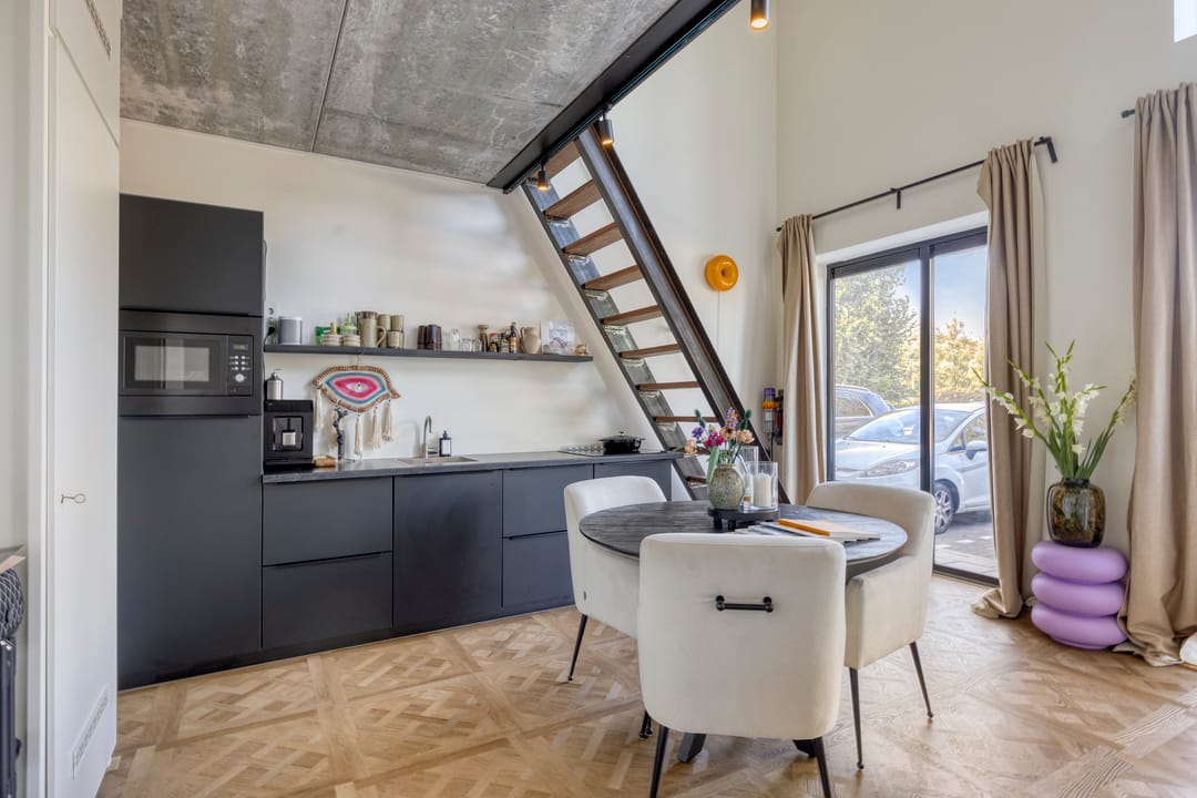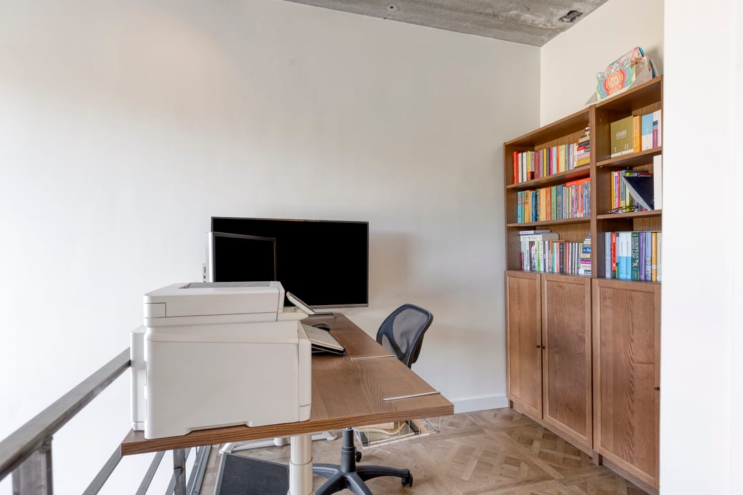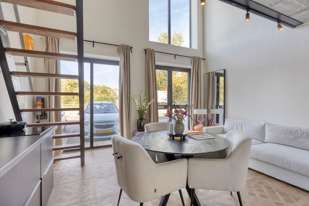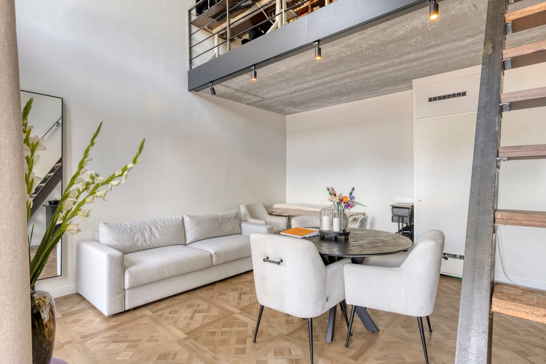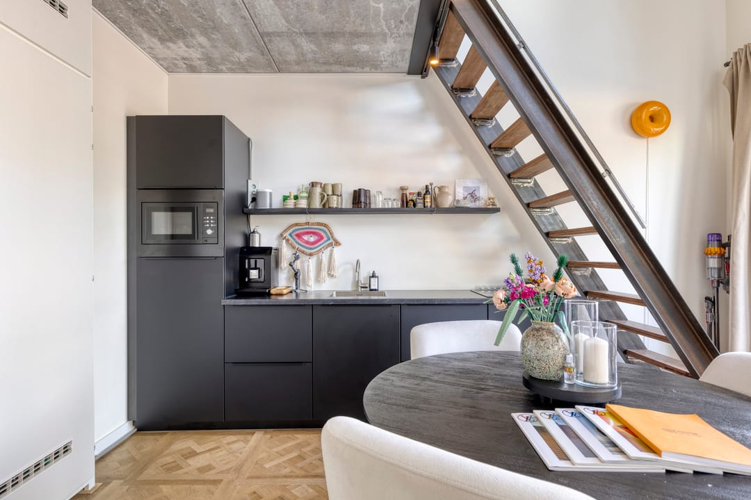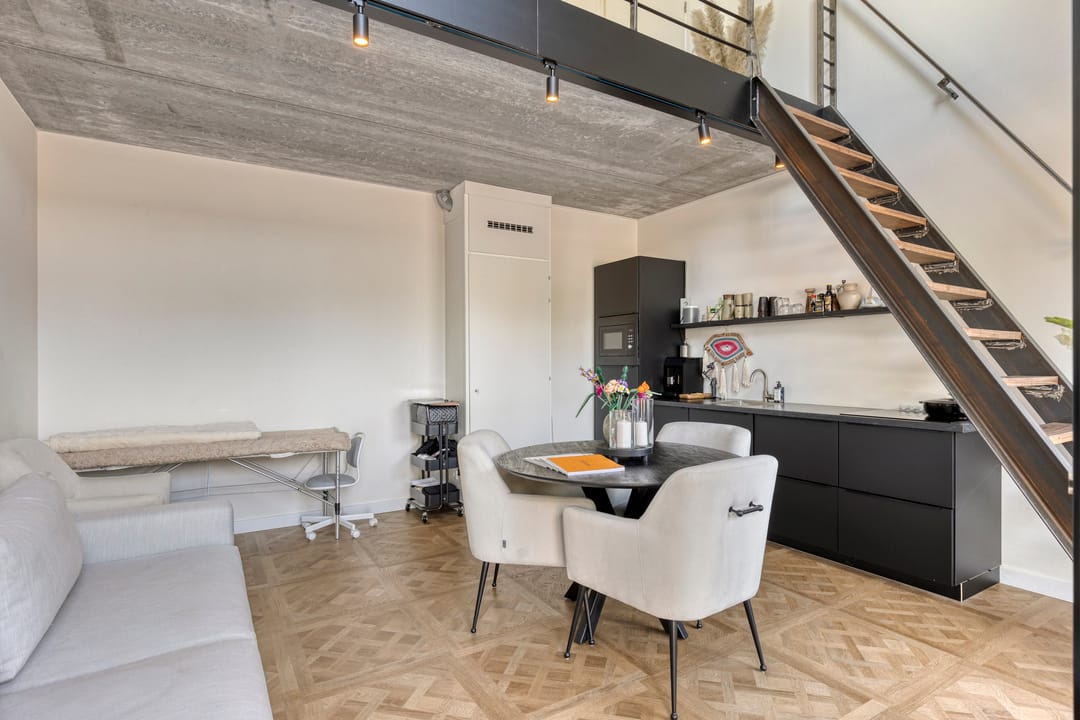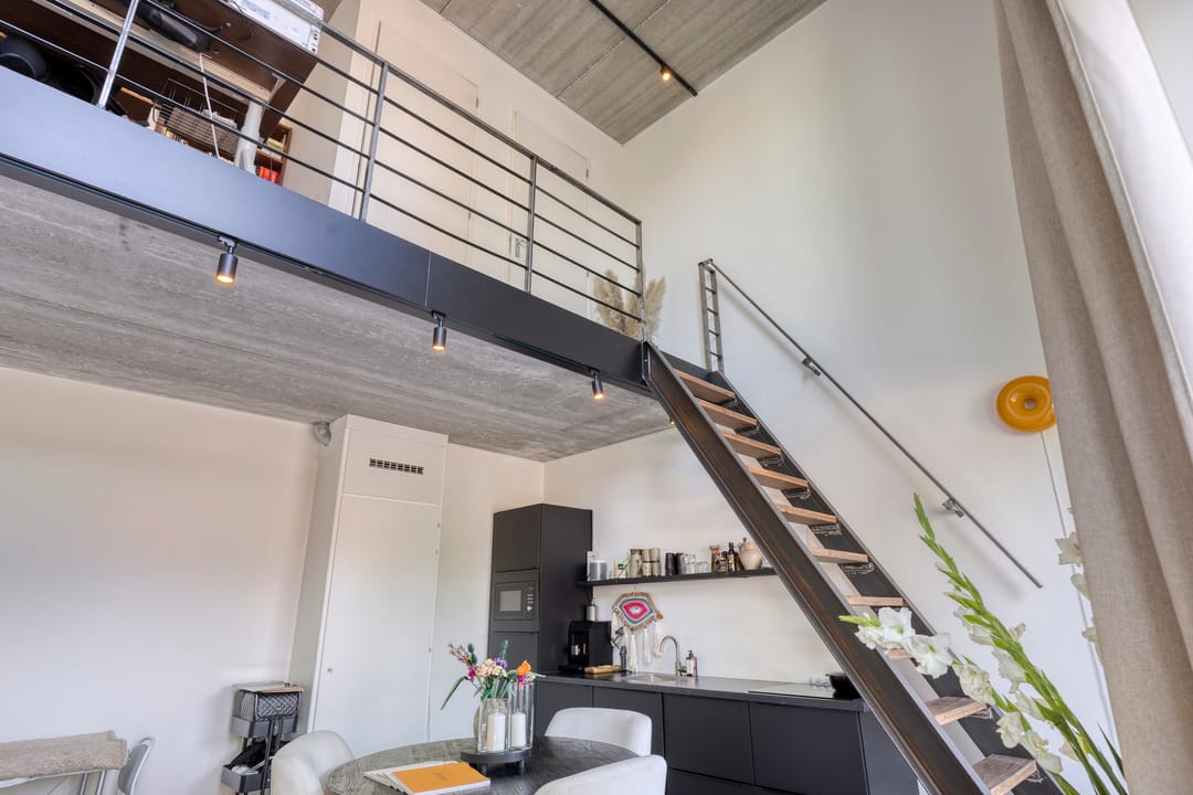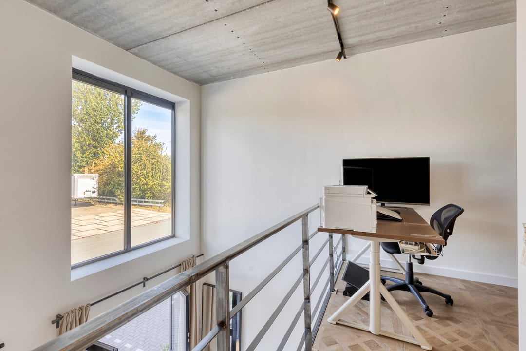 Mezzanine/loft: Via een industriële trap bereikt u de open vide, ideaal als extra kantoorruimte, vergaderplek.