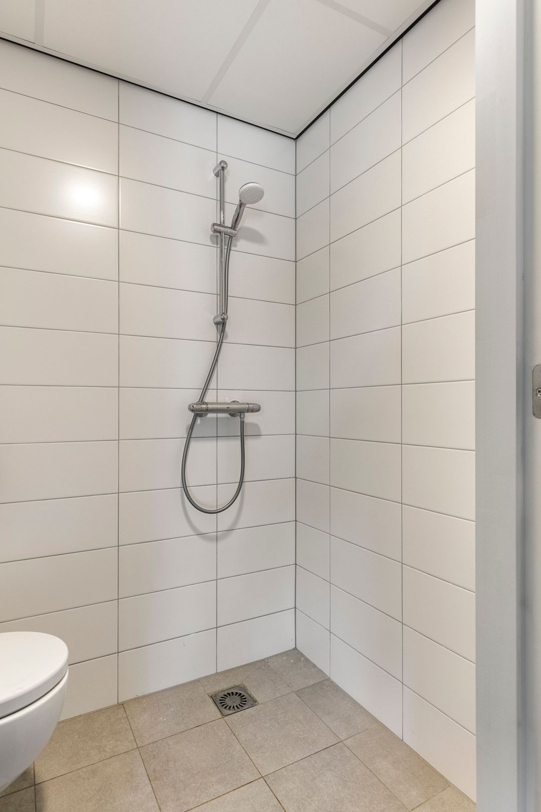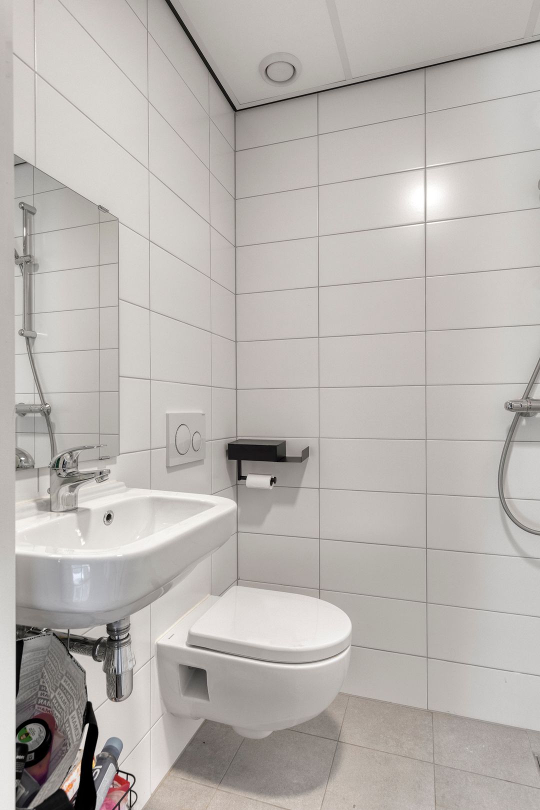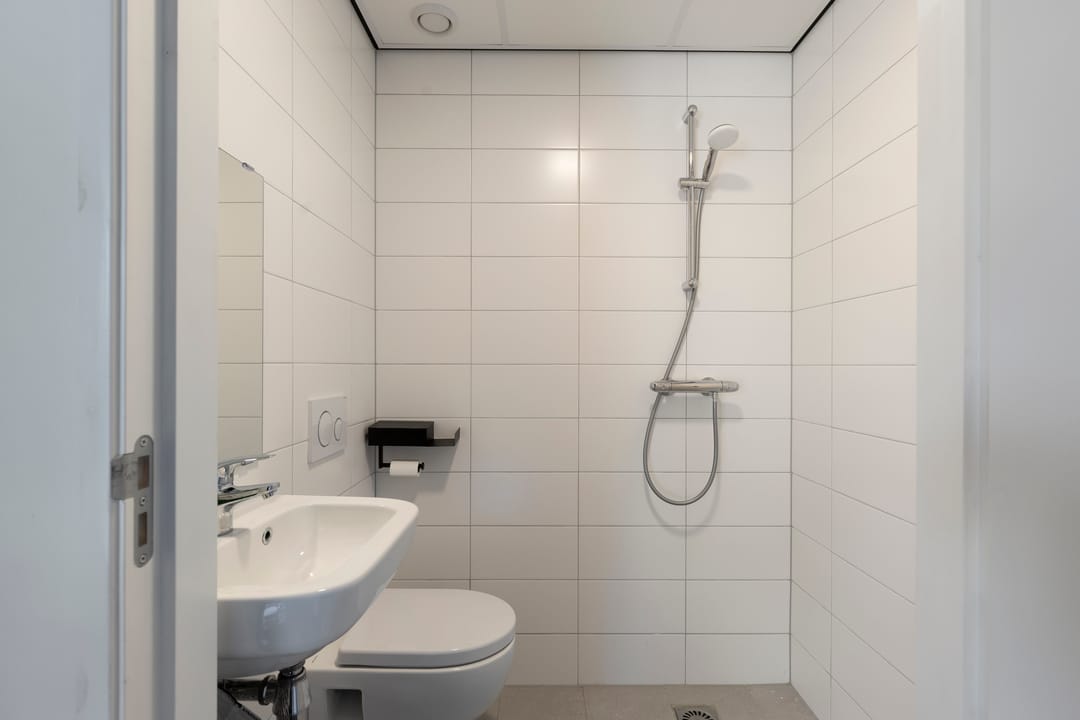 Sanitair: Moderne badkamer met douche, toilet en wastafel.