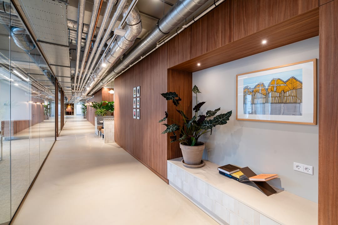 - Industrieel plafond voorzien van led verlichting (d.m.v. led lijnen) en akoestische geluidspanelen;
