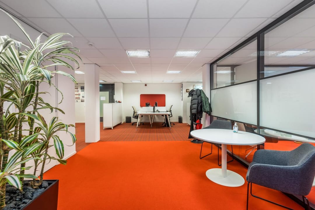 - Ca. 320 m2 kantoorruimte op de tweede etage, fraai ingedeeld in open werkplekken en twee afzonderlijke ruimtes, bijv. te gebruiken als kantoor of vergaderruimtes.