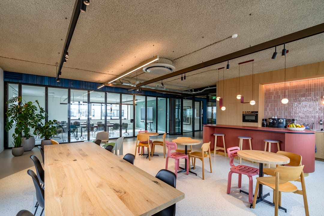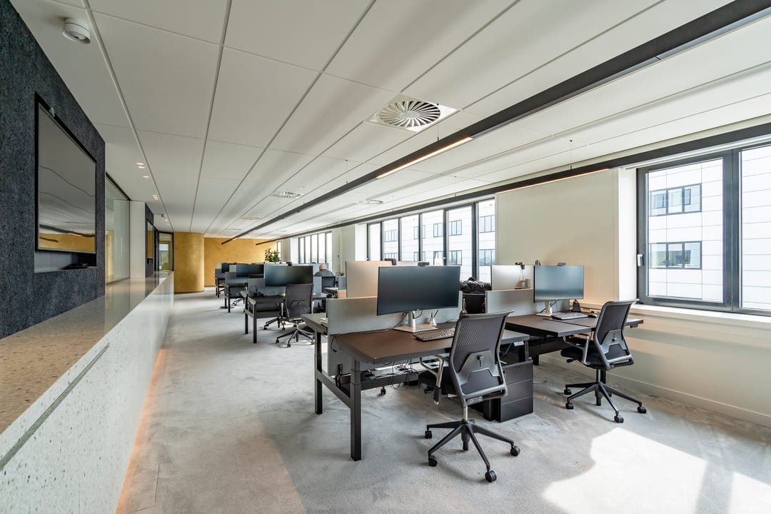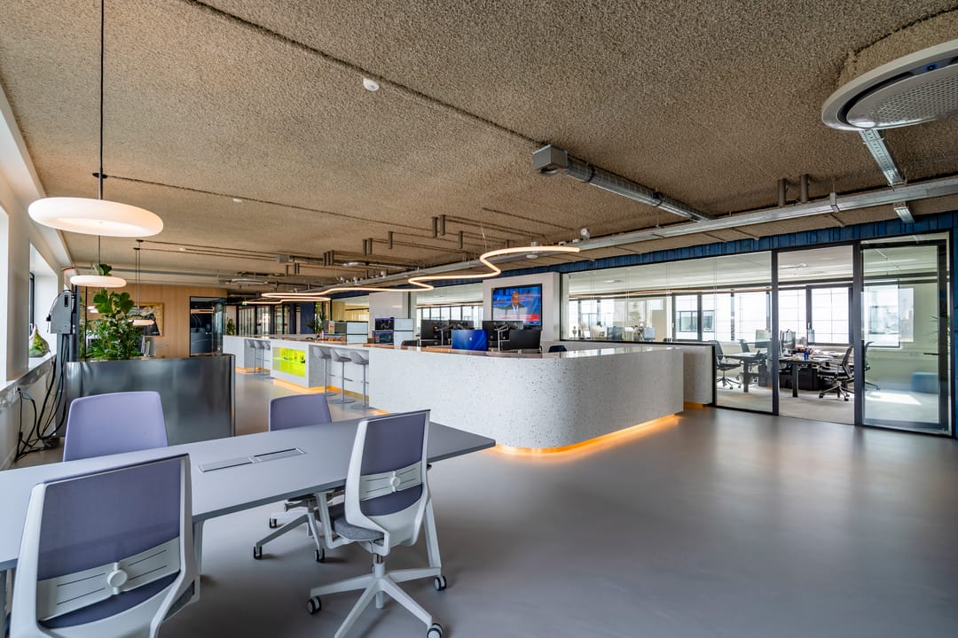 - plafond grotendeels voorzien van akoestisch spuitwerk voorzien van hangende verlichtingsarmaturen en klimaatsysteem;